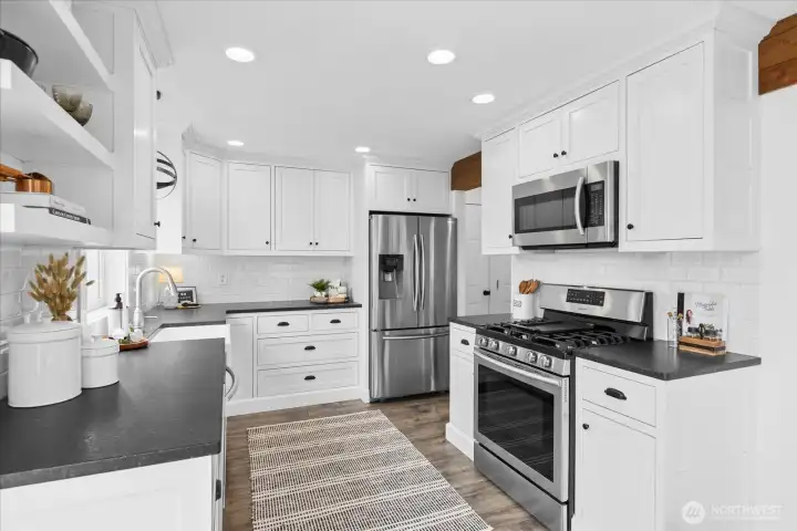 This modern kitchen is fully equipped with custom white cabinetry, quartz countertops, a large farmhouse sink, SS appliances, and tile backsplash.