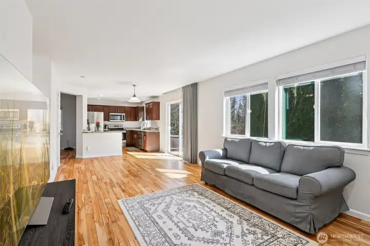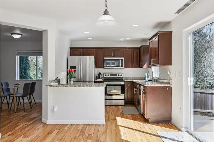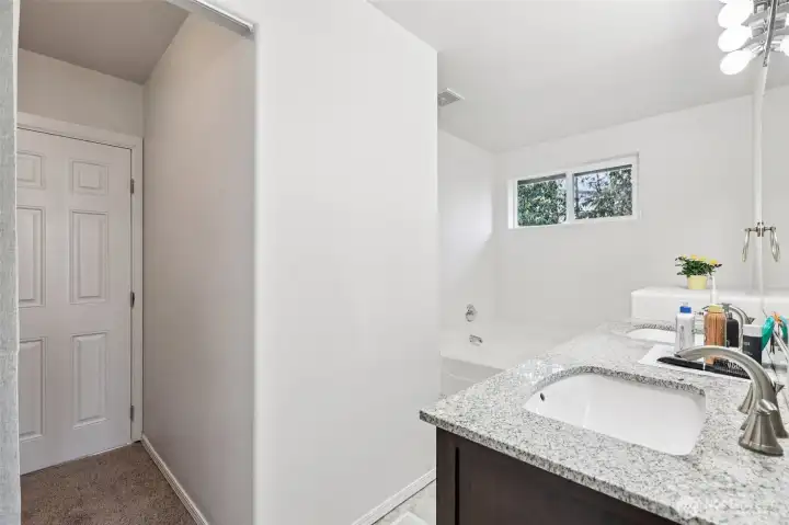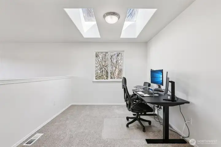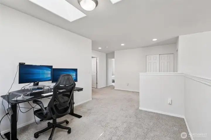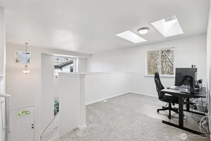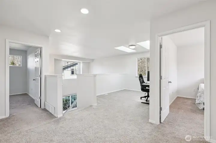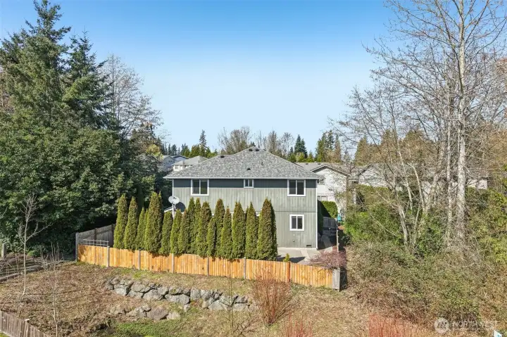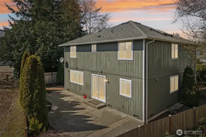 Beautifully maintained 3 bedroom, 2.5 bath home located in highly desirable South Everett. This thoughtfully designed 2 level residence showcases quality craftsmanship, functional living spaces, & abundant natural light enhanced by high ceilings, multiple large windows & skylights. The spacious primary suite serves as a private retreat, featuring a well-appointed five-piece bath with double vanity, soaking tub, and separate shower. Two additional generously sized bedrooms provide flexibility for household members, guests or workspace needs. An open loft with skylight offers the perfect setting for a home office or a creative space, while the versatile bonus area can easily function as a playroom, media room, or additional lounge. On the main level, the inviting family room is anchored by a cozy gas fireplace and flows seamlessly from the kitchen, creating an ideal layout for both everyday living and entertaining. Step outside to an oversized patio, perfect for morning coffee or evening gatherings, overlooking a fully fenced backyard with no direct neighbors. Enjoy enhanced privacy with a lush greenbelt backdrop, along with the added benefit of having the community park just beyond your backyard—ideal for recreation & outdoor enjoyment. Conveniently located just minutes from shopping, dining, and everyday amenities, including major retailers, and offering easy access to major highways, this home combines comfort, convenience, and lifestyle in one exceptional package.