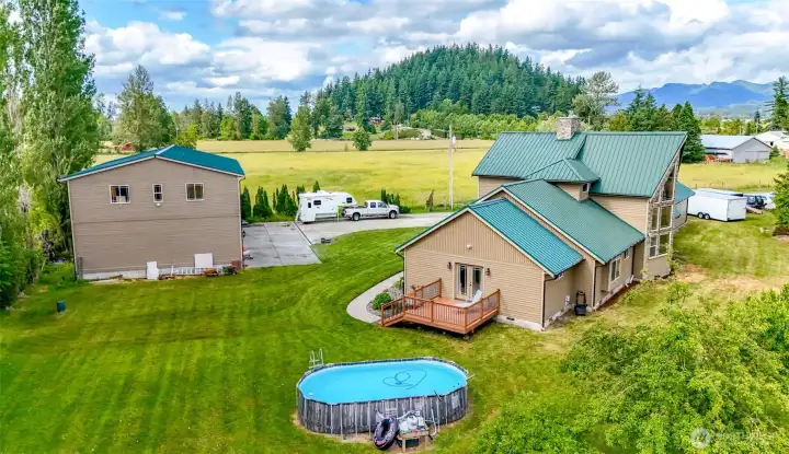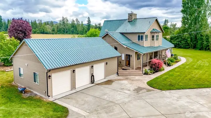 Gorgeous Custom Home on 2.66 acres +/- w/beautiful mountain views. Over 3300Sf w/3 bedrooms 2.5 bathrooms, huge gourmet kitchen w/ island. Great room concept w/ 2 story river rock fireplace, vaulted ceiling's & floor to ceiling windows. Upstairs primary suite w/fireplace & 5 piece bath, complete w/jetted soaking tub and oversized shower. You will love the 2 large main floor bedrooms. The separate rec room leads to the side yard and has a wet bar. Huge 2 story detached shop (4300 +/-sf), with the possibility of an ADU. The attached 3 car garage (1350 +/- sf) has a hobby/storage room. Ideal for horses, mechanics, hobbyists, RV's and more! There are many fruit trees and plenty of garden spaces! Close to 410, downtown Enumclaw and Buckley!