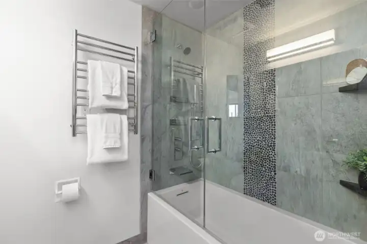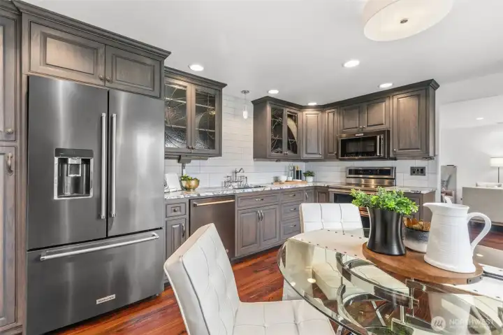 Meticulously upgraded 4-bedroom, 1.75-bath home. Thoughtfully designed living space blending timeless materials with modern functionality, creating a warm yet refined atmosphere throughout. The main living areas showcase stunning East Indian rosewood flooring, complemented by a custom marble fireplace surround with cozy natural gas. A separate family room provides flexibility for today’s lifestyle. The chef’s kitchen is both elegant and highly functional, featuring thick slab marble countertops, custom soft-close cabinetry, under-cabinet outlets with integrated speakers, and a premium KitchenAid appliance package with double oven. A custom stained glass pocket door adds a unique architectural touch. The spa-inspired bathroom offers a true retreat, complete with a ½-inch glass shower enclosure, multiple body jets, and rain shower system, along with a heated towel rack, custom cabinetry topped with marble. The entire top floor is a dedicated primary suite retreat, featuring new LVP flooring, updated cabinetry, and versatile spaces for a home office, reading nook, or lounge. Additional upgrades include powered Hunter Douglas blinds, high-end dimmable lighting, in-wall TV mounting access, sleek Johnson Controls glass thermostat, and central A/C with a natural gas furnace. Outside, enjoy a $25,000 Brazilian redwood fence built to last 75 years, custom illuminated retaining wall, Rain Bird irrigation system, and outdoor kitchen readiness—perfect for entertaining year-round.