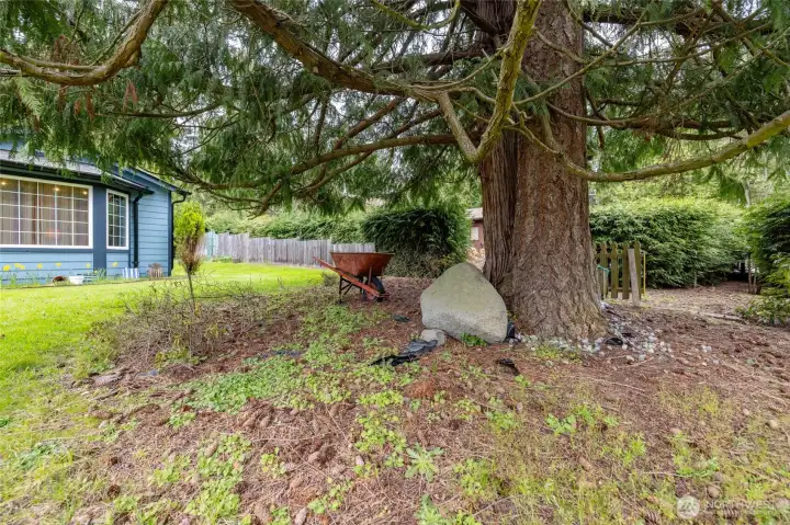 The back yard is private and surrounded by greenery
