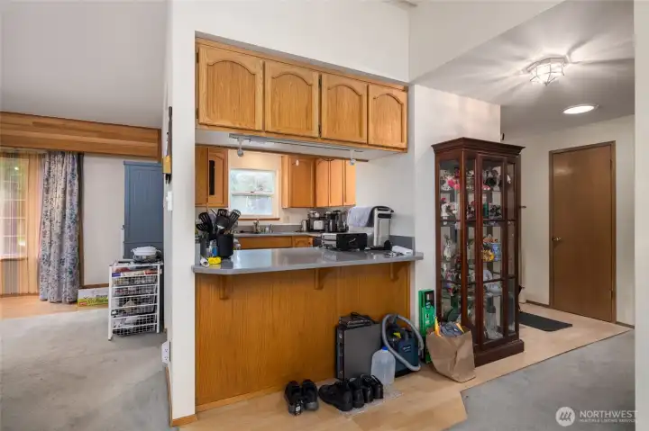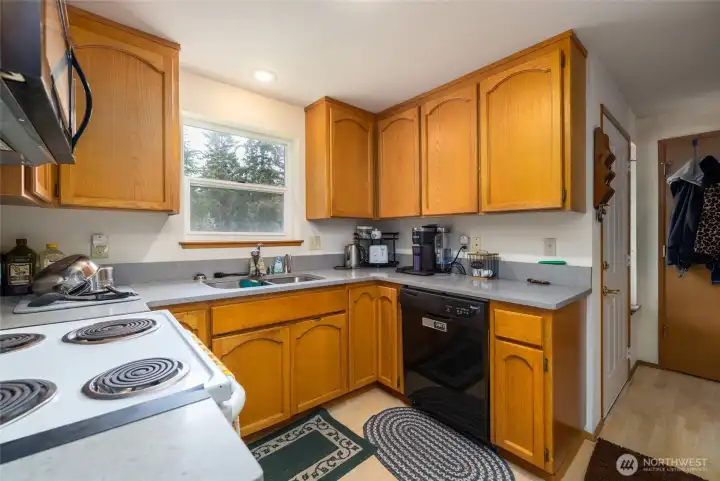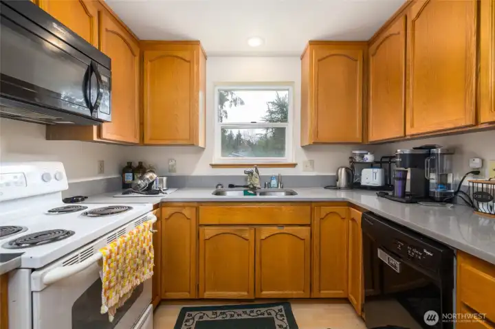 The efficient kitchen features updated floors and countertops, and fresh new paint