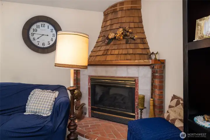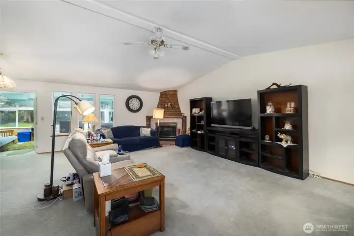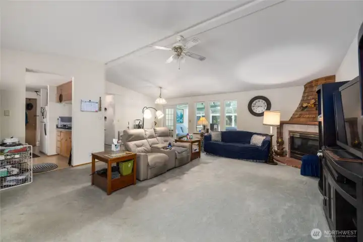 Spacious greatroom with bay window, vaulted ceilings, and gas firepace in the corner