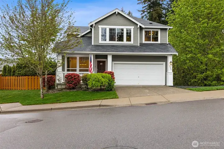 Front view of home, what a location! HOA woods and property to the right and behind, plenty of parking in your driveway and on the street for you and your guests.