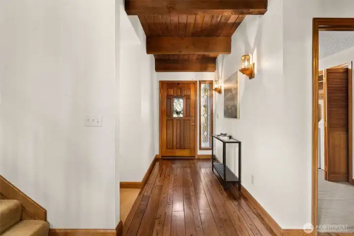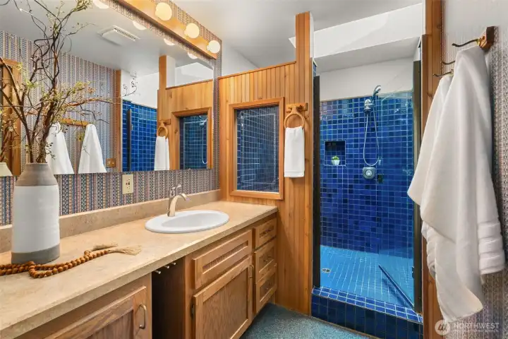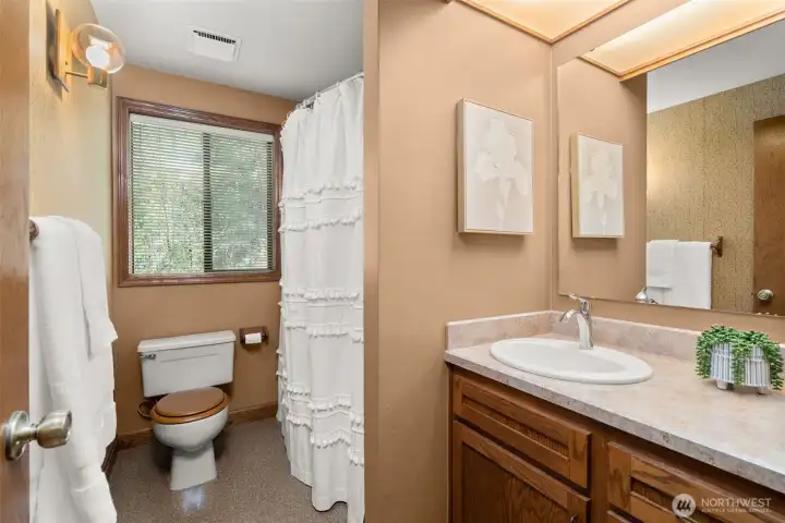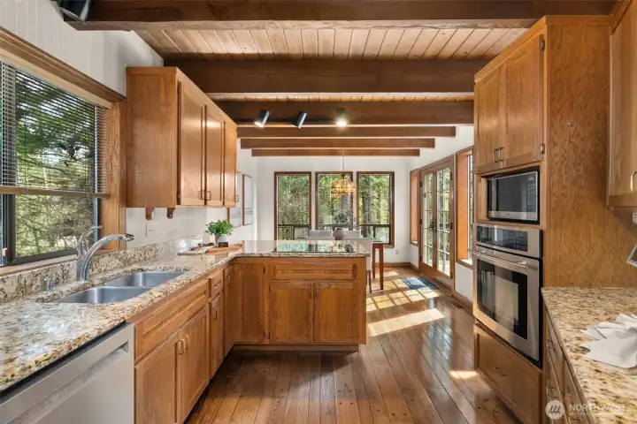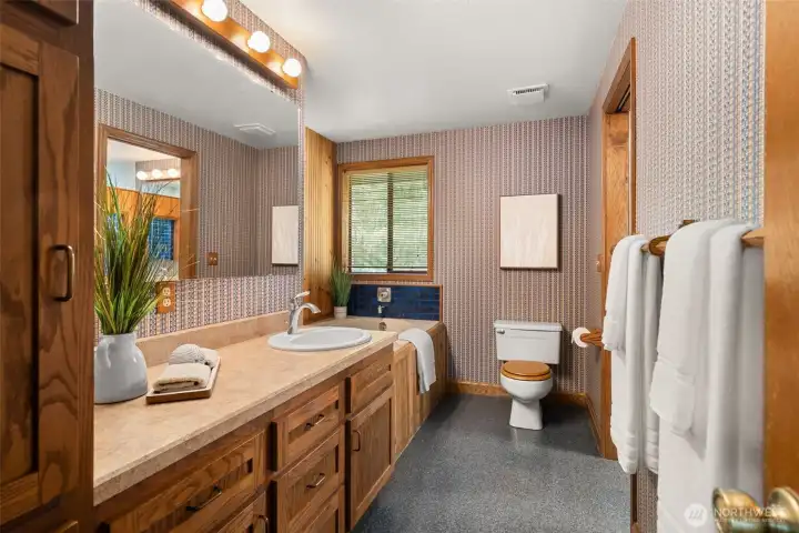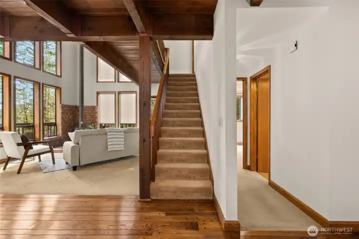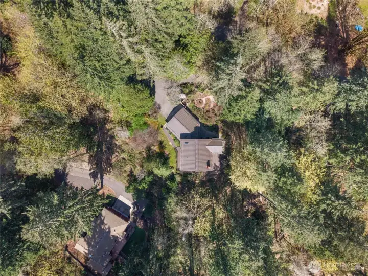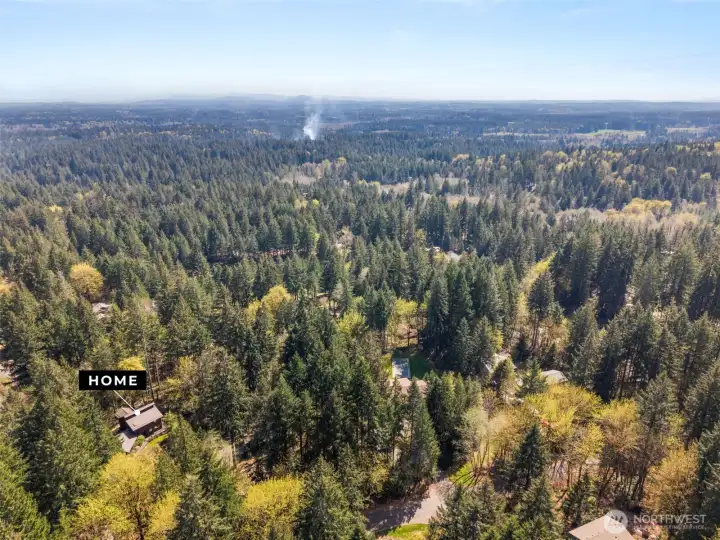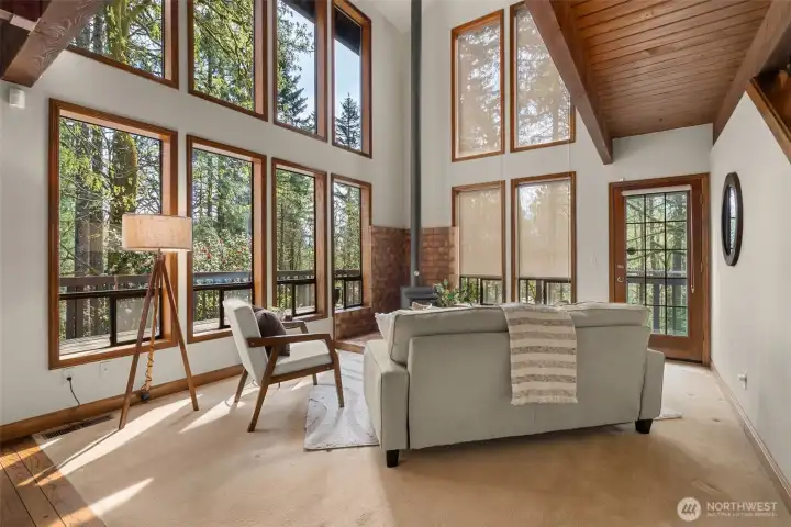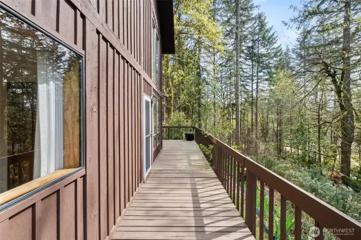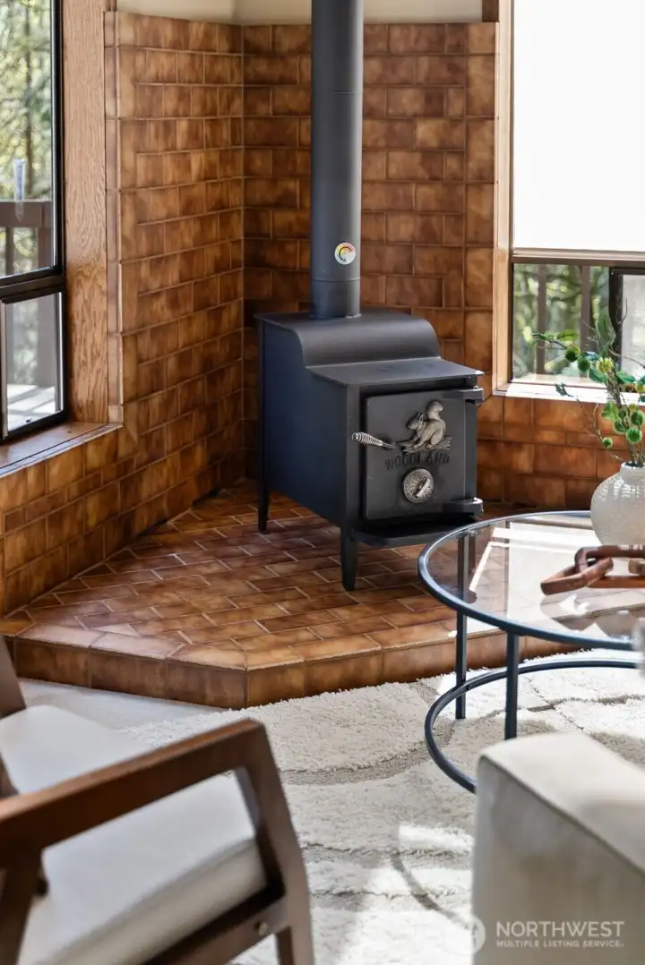 A true Northwest Contemporary retreat set on just over an acre in Alpine Hills, where mature evergreens and natural surroundings create a setting that feels more like a private park than a traditional homesite. Walls of windows draw the outdoors in, filling the home with natural light and offering a constant connection to the landscape. The architecture is both distinctive and functional, with a main level bedroom and full bath that provide flexibility for guests or multi-generational living. The kitchen features updated appliances and granite countertops, complemented by classic oak cabinetry and a layout that opens to the dining area and deck, creating an easy flow for everyday living and gatherings. Upstairs, the primary suite is a standout, featuring a vaulted ceiling, a spa-inspired bath with a soaking tub, full tile dual headed shower with skylight, and a private hot tub ready deck tucked into the trees. A loft space overlooking the main living area adds versatility, along with a third bedroom positioned on the upper level. Outdoor living is just as compelling, with expansive decking that invites you to relax, entertain, or simply take in the peaceful surroundings. The wooded setting offers privacy and a sense of escape, while still being within convenient reach of nearby amenities. A rare opportunity to experience Northwest living in its most authentic form, where architecture and setting come together in a way that feels both timeless and truly special.
