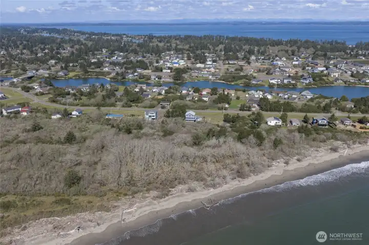 To the west, you see Oyhut Bay Seaside Resort, Lake Minard, and the ocean beaches.