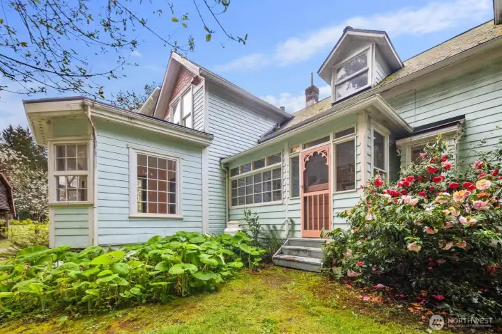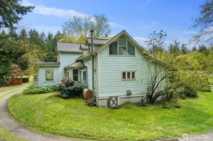 Set on a storybook parcel surrounded by evergreens, this timeless farmhouse offers a rare blend of character, scale, and opportunity. A wide, welcoming porch and classic architecture create an immediate sense of arrival, while expansive grounds invite a lifestyle rooted in privacy and connection to nature. Inside, original hardwood floors, vintage millwork, and generous living spaces reflect enduring craftsmanship. Sunlight fills the home through large windows, creating a warm and inviting atmosphere. Distinctive architectural details and flexible living areas offer both charm and versatility for modern living. The kitchen maintains its classic appeal with solid surfaces, statement range, and easy connection to gathering spaces—ready to enjoy or reimagine. Upstairs, spacious rooms and unique layouts provide options for a variety of lifestyles or future updates. Outdoors, the property opens to usable land with multiple outbuildings, including a large detached garage/shop and additional structures—ideal for hobbies, storage, or creative use. A rare opportunity to own a home with presence, land, and long-term potential in a peaceful, natural setting.