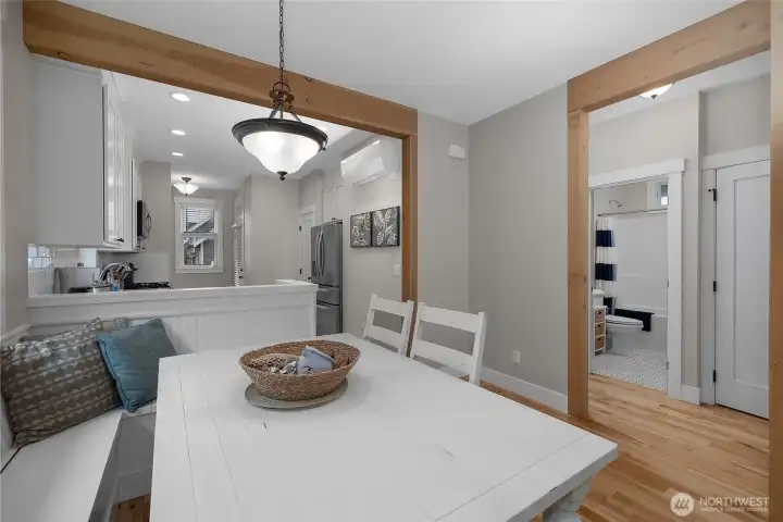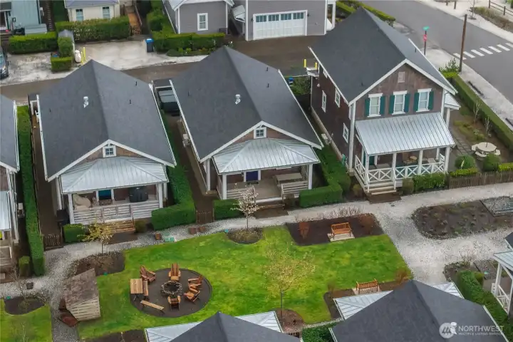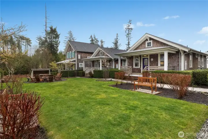 Welcome to coastal living in this bright and cozy home located in The Croft neighborhood. This charming residence features an open-concept design that effortlessly connects the living, dining, and kitchen areas. Character-rich, custom-built elements enhance the space, including practical mudroom bench storage and built-in dining room bench seating. The private primary bedroom boasts an en-suite bathroom. A second bedroom is situated near a separate full bathroom. The outdoor area is ideal for enjoying the coastal air, offering valuable off-street parking, a useful storage shed, and a soothing hot tub. Relax on the welcoming, covered front porch or socialize with neighbors around the community fire pit, conveniently located right outside the front door. The home is perfectly situated for leisurely strolls to the town center or the beach.