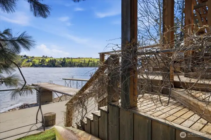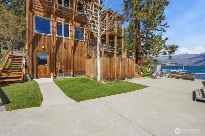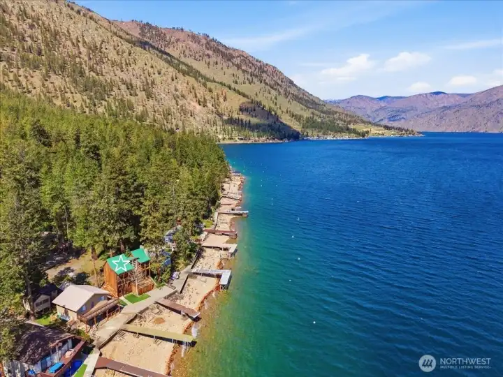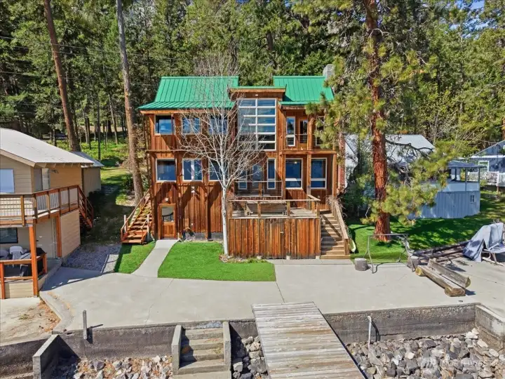 Quintessential South Shore Lake Chelan waterfront retreat with rare second parcel and charming guest cabin! Enjoy 50 ft of prime waterfront with private dock, bulkhead, and easy lake access via dock and steps into the water. The main home and guest cabin each offer 2 bedrooms, creating ideal space for hosting and multi-generational enjoyment. Architecturally pleasing design features abundant natural light, expansive lake-facing windows, and a cozy wood-burning fireplace. Outdoor living shines with a spacious patio, multiple deck areas, and plenty of parking. Set on .28 acres, the property is tucked among mature pine trees, offering privacy and a true getaway feel. Domestic water is sourced from Lake Chelan. Well maintained with a partially finished basement providing generous storage. A treasured property held in the same family for approximately 80 years—this is a rare opportunity to own a special South Shore legacy property. (Property addresses are 12632(Main Home) & 12624(Back Cabin) S Lakeshore Rd). Most Furniture & Furnishings are staying with home minus some excluded items.