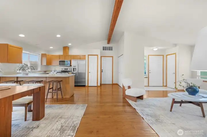 Beautifully maintained single-level home with no stairs, tucked away on a quiet cul-de-sac in the heart of Lake Stevens. Located within the highly sought-after Lake Stevens School District, this home offers the perfect blend of comfort, functionality, and location. Step inside to find a light-filled layout with vaulted ceilings in the living room, creating an open and inviting atmosphere. The kitchen is equipped with all new stainless steel appliances and flows seamlessly into the main living space—ideal for both everyday living and entertaining.Enjoy generously sized bedrooms, including a well-appointed primary suite designed for relaxation. Additional features include a 2-car garage with generator hook-up, central A/C, and an enormous crawl space with high ceilings perfect for abundant storage. Outside, the fully fenced, easy-to-maintain yard offers a private space to unwind or host gatherings without the upkeep. Just minutes from parks, shopping, and commuter routes—this home checks all the boxes."