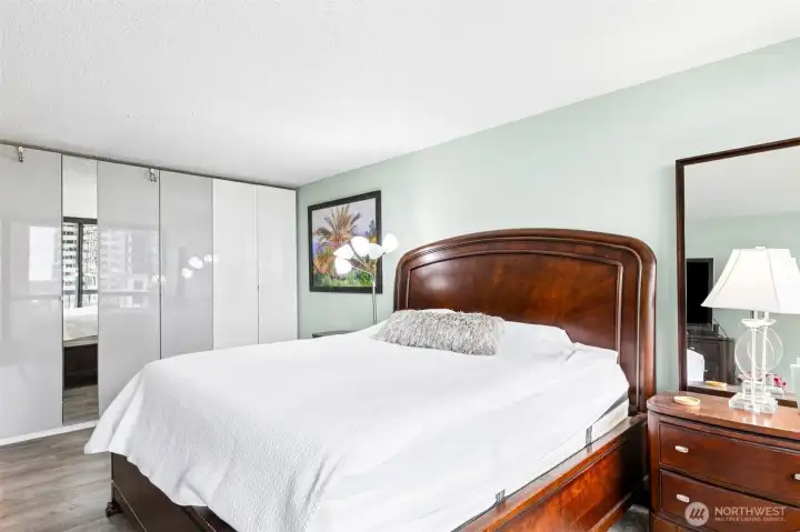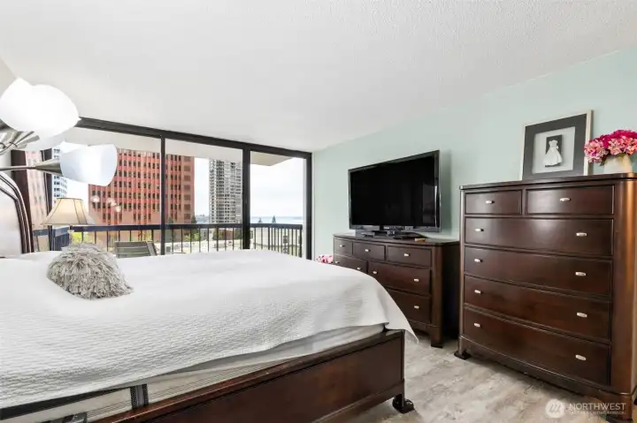 Large primary suite with NEW LVP flooring and floor to ceiling windows that step out to the second deck of this unit for an incredible view.
