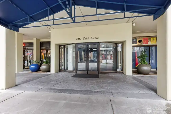 Lobby entrance includes Amazon lockers, mailboxes and elevators