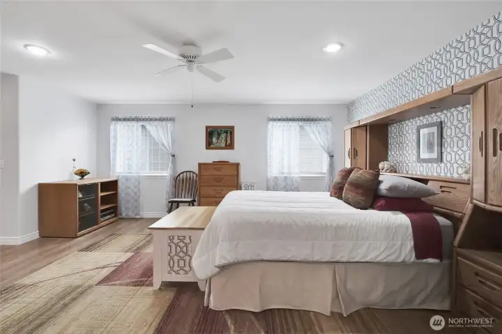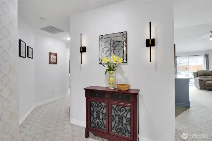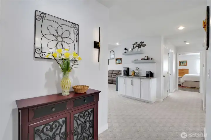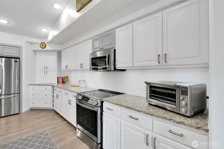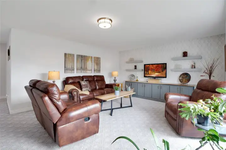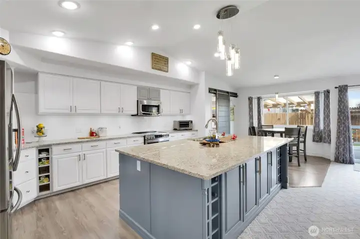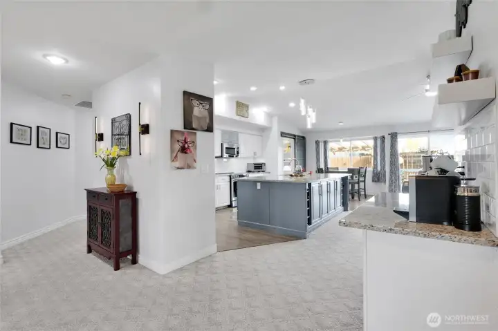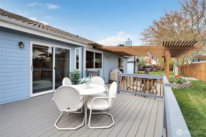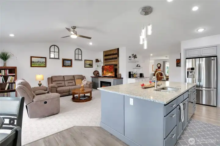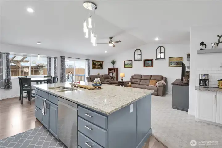 This Desert Highlands, 216 E. Tanglewood Dr. stunner showcases thoughtful updated comfort and practical functionality. Causally entertain friends and family in the two (2) spacious living areas, and the stunning open-concept kitchen. The kitchen features: updated appliances, an over-sized stone topped island w/ sink, soft-close cabinet doors, a walk-in pantry with barn-door, a kitchen cooking center with appliance 'garage', three large pull-out lower cabinet trays/slides/pullouts for those hard to reach cooking essentials, and abundant cabinet storage. Adjoining space is shared with a 'Coffee Bar' area, and relaxed family room with modern electric fireplace and TV entertainment area. Sliding doors invite you outside onto a spacious low maintenance deck area, and patio BBQ grilling & cooking space and beautifully landscaped backyard with storage shed. The primary suite features a large walk-thru closet to the dedicated bathroom and step-in shower. Complete with an over-sized insulated 3-car garage, with built-in storage cabinets and a utility sink, new (2024) HVAC, new (2024) replacement Anderson® lifetime warranty windows, covered front porch, and gutter guards—this home is truly move-in ready and easily to impress.