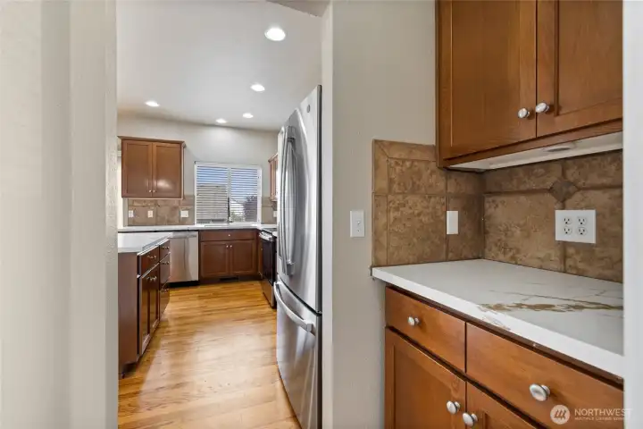 Fresh and new inside and out! Open floor plan with eat in kitchen open to great room with gas fireplace. The new appliances, kitchen sink and solid counters will delight the chef. The real hardwood floors have been freshly refinished and are move in ready.. This incredible home boasts Five bedrooms (one on main with full bath also on main), as well as a giant bonus room upstairs. The corner lot is oversized and ready for your outdoor games. Second floor laundry. Butler pantry with pocket door.