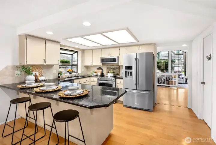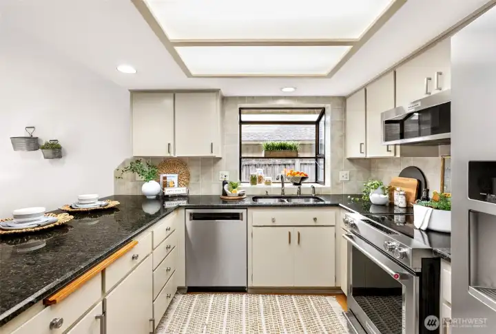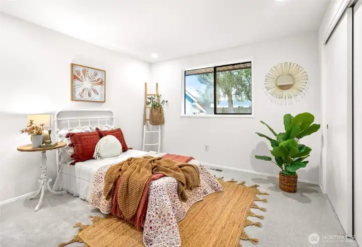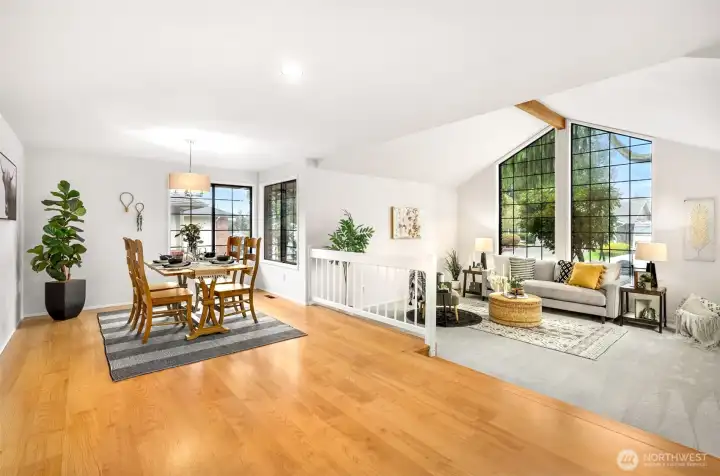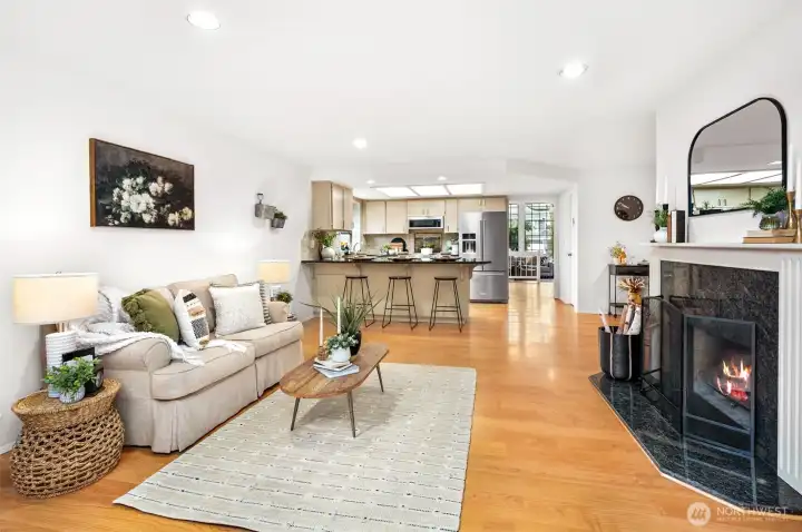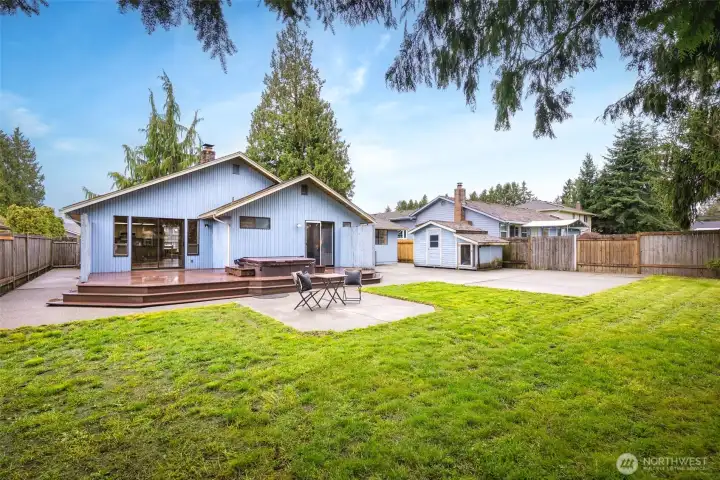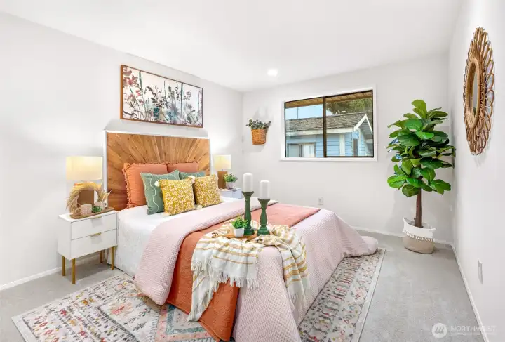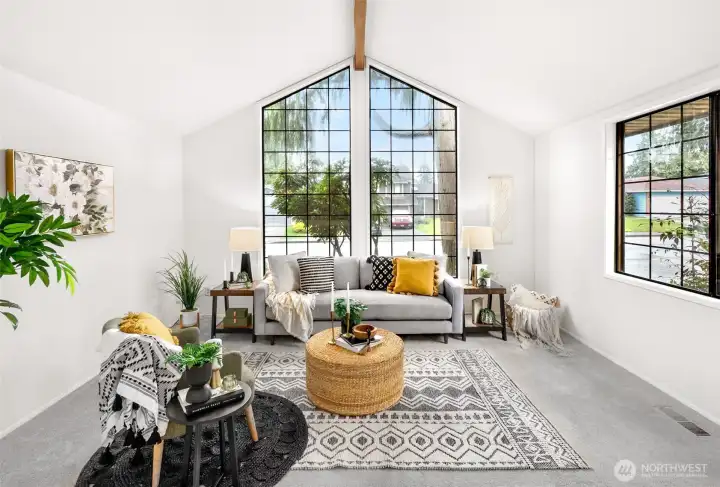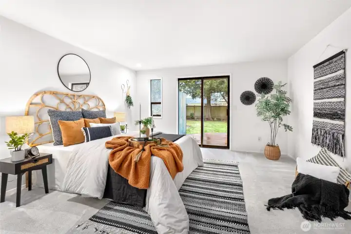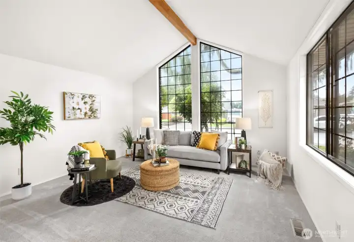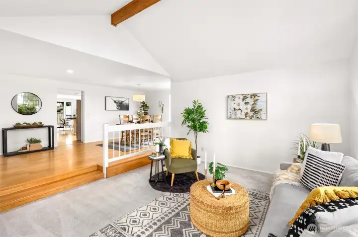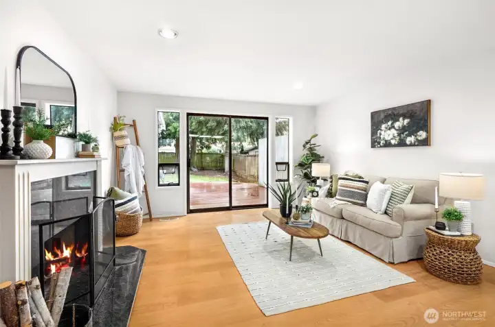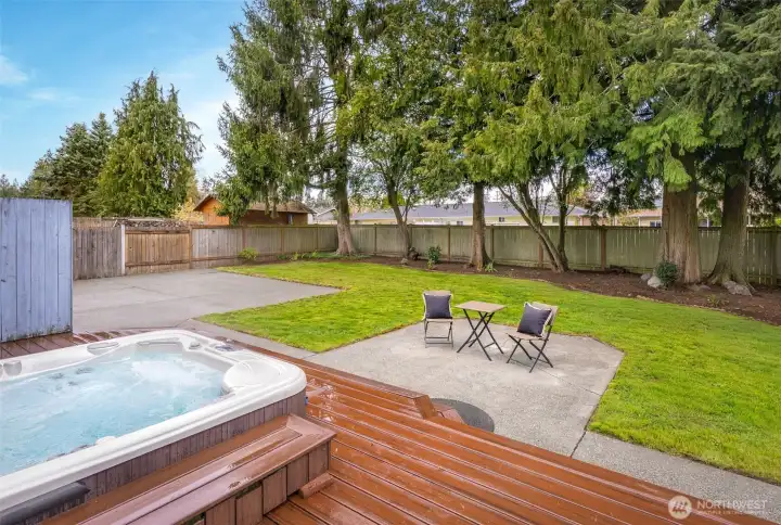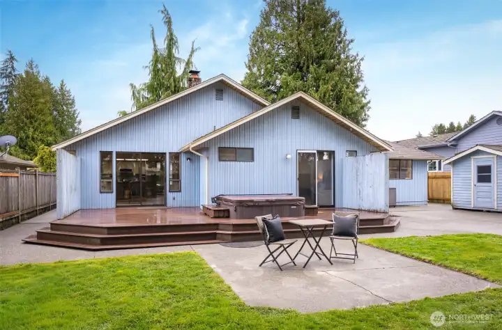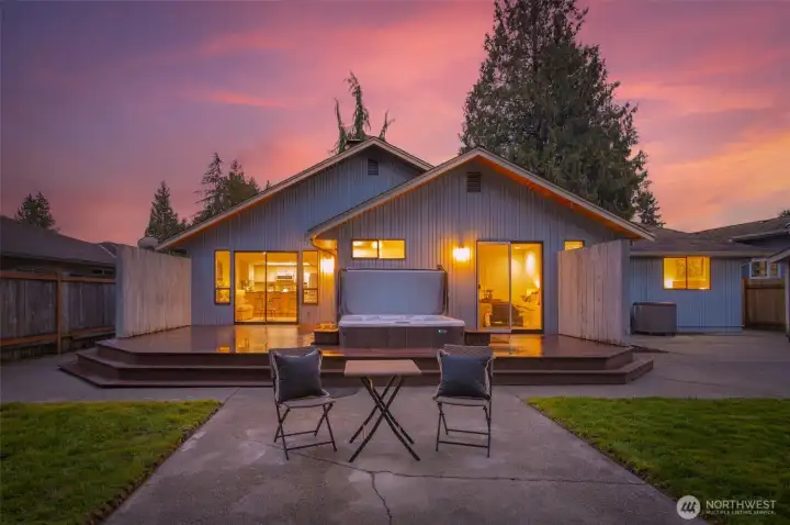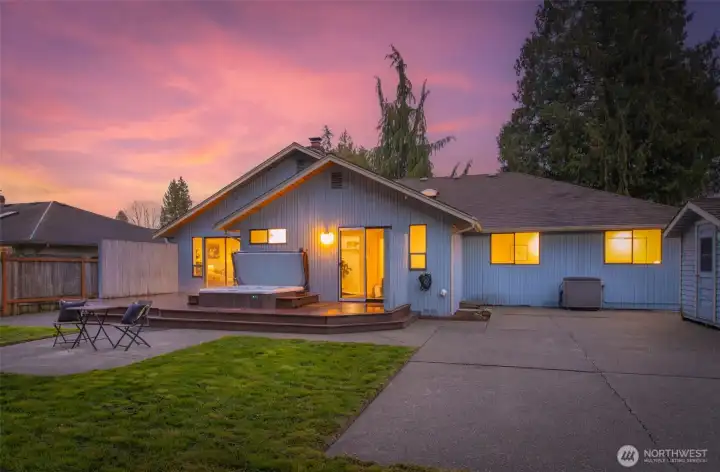 Ideally located just minutes from Boeing, Paine Field, and a wide variety of shopping and dining, this Everett rambler offers the perfect blend of comfort and convenience. Enjoy simple daily routines with local schools and parks just steps away, plus quick access to commuter routes. A spacious entry welcomes you in with bright, fresh paint, leading into a sun-filled living room with vaulted ceilings, exposed beams, and oversized windows. The adjacent formal dining space is designed for effortless entertaining, while the kitchen boasts stainless steel appliances, generous prep space, a walk-in pantry, and a sunny breakfast nook. A secondary living room, warmed by a cozy fireplace, opens directly to your outdoor retreat, complete with a large back deck, fully fenced yard, and a relaxing hot tub. Down the hall, the primary suite features private deck access, a walk-in closet, and an ensuite bath, while two additional bedrooms, a full hall bathroom, and a centrally located laundry room provide flexibility for guests or growing households alike.