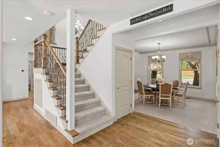 This view shows the double staircase to the landing leading upstairs.
