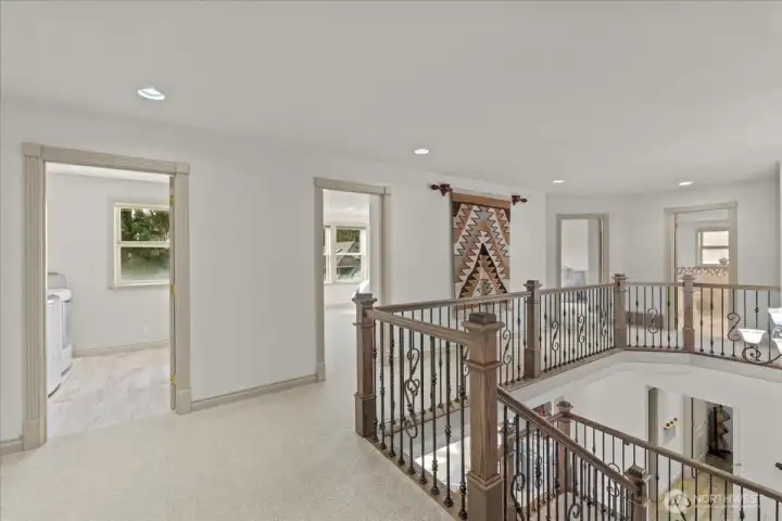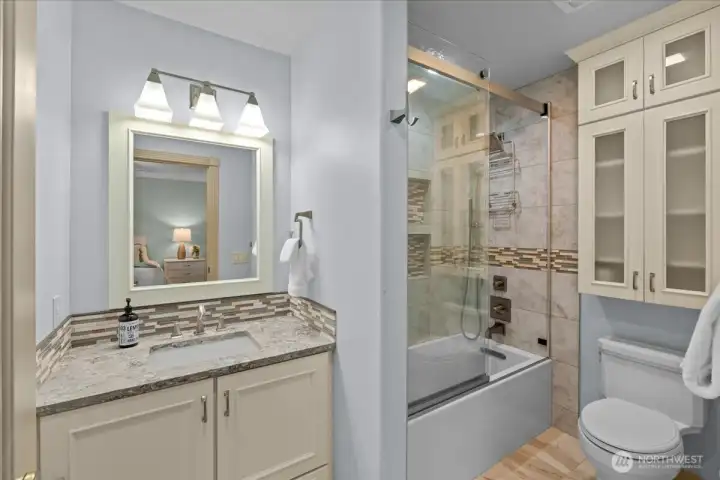 Three quarter bath upstairs, dual vanities with quartz countertops, plus large walk in shower.