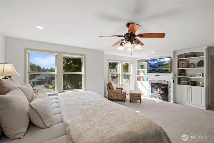 Double door entry to the stunning primary suite - you'll find the dedicated sitting area and fireplace as shown in the photo.