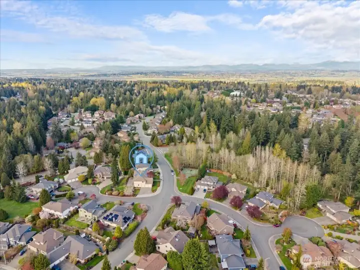 Overhead view shows the playgound area accessed by a trail in the cul-de-sac.