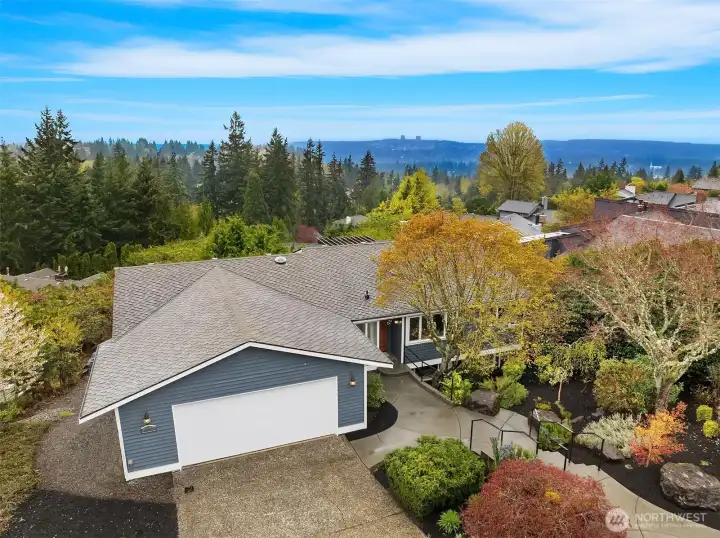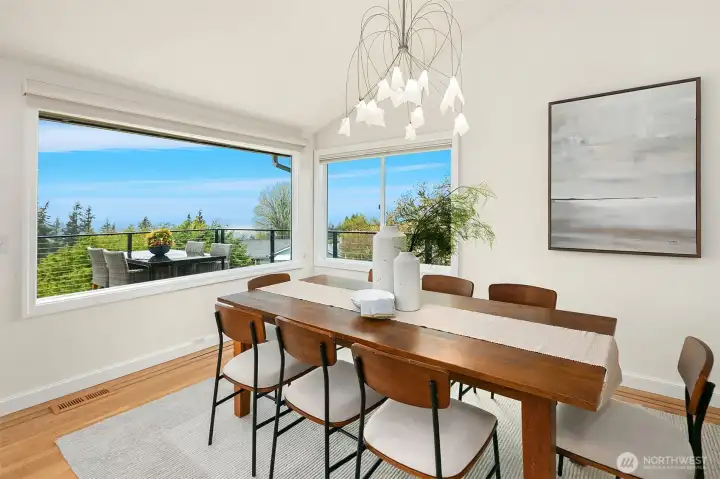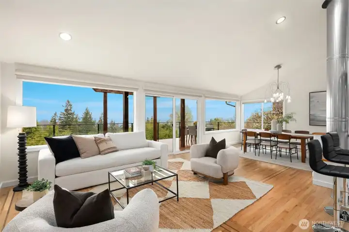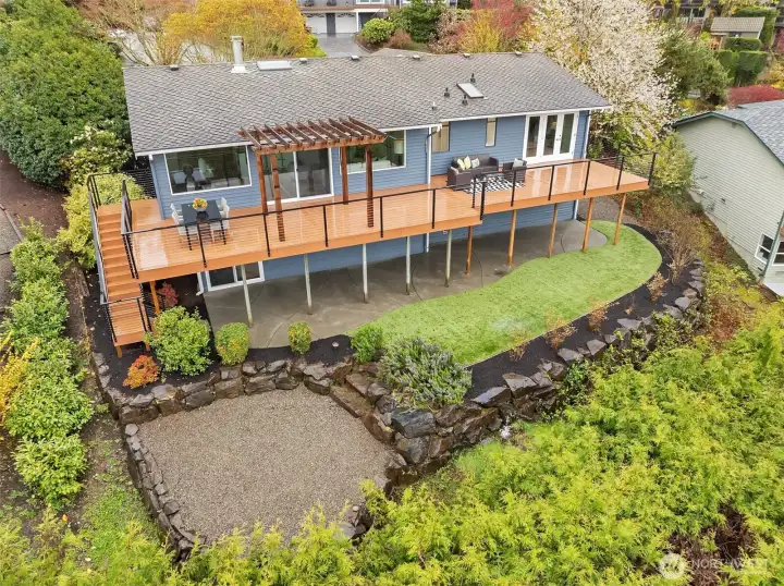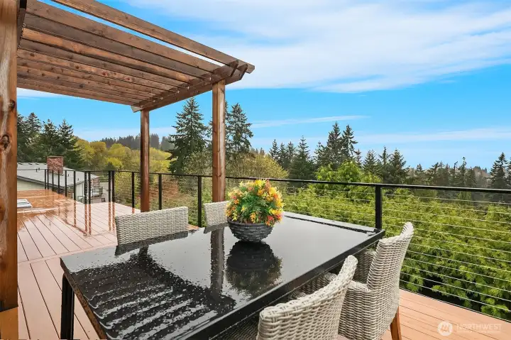 Expansive deck with views of Bellevue, Sound and mountains.