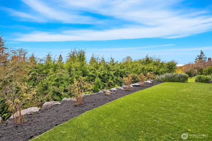 Verdant yard with mature plants greet you.