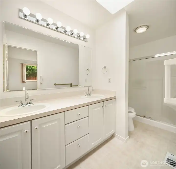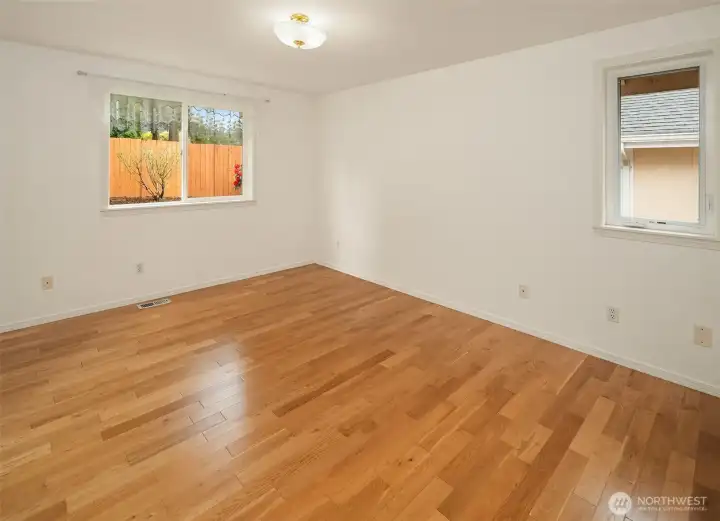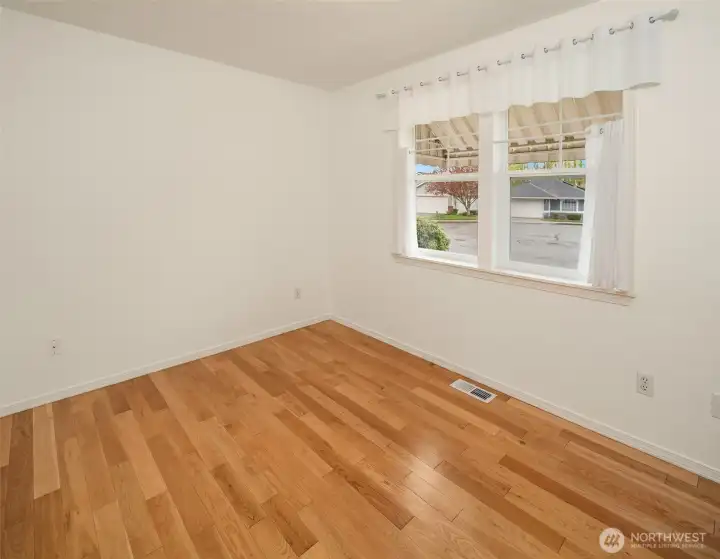 EASY-LIVING LUXURY ~ Tucked away on a quiet cul-de-sac with serene evergreen views in Puyallup's premier 55+ gated community, Willow Gardens, this 1,520sf move-in ready rambler is where the comforts of a single-family home meets the convenience of a low-maintenance condo! Gorgeous curb appeal with covered entry, manicured gardens & brick accents. Clean & pristine, the open concept floor plan features fresh paint & upscale hardwood floors throughout. Welcoming foyer opens to grand living room with upgraded gas fireplace & slider to covered deck. Generous open kitchen with peninsula breakfast bar features soaring skylights flowing into the light-filled dining space. Primary bedroom features recessed lighting, walk-in closet & ensuite with full-size shower & sprawling dual-sink vanity. Guest bedroom + den/office & full bath with tile floors. Large utility room with cabinetry opens to double garage with storage. Efficient new heat pump/central A/C. Low HOA dues include water/sewer & lawn maintenance. You'll love the peaceful setting & vibrant neighborhood with YMCA at your doorstep & abundant amenities just moments away!