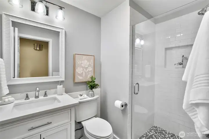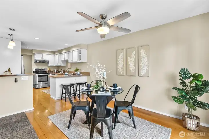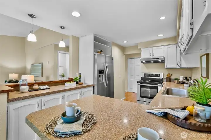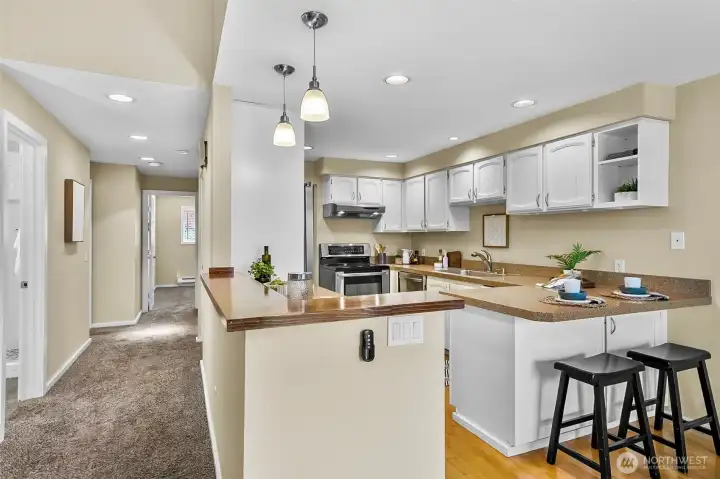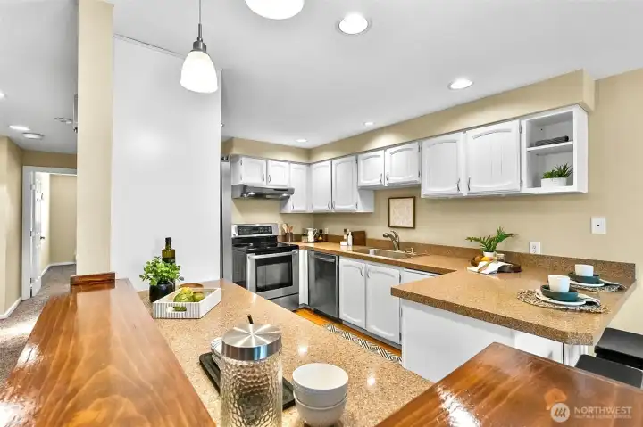 Tastefully updated 2-bedroom, 2-bath condo steps away from downtown kirkland! This home features an updated kitchen with ample counter space, Stainless steel appliances, hardwood flooring and pull up counter seating. The primary bedroom is generously sized with beautifully updated primary bathroom. This unit has an oversized living room with vaulted ceilings, fireplace, remodeled main bathroom and in unit washer and dryer. The back deck overlooks mature landscaping and has peekaboo views of Lake Washington. This unit includes 2 large covered parking spots and additional storage. Moss Bay Village is a very desirable complex with only 20 condos, community clubhouse, beautiful landscaping, plenty of guest parking and easy freeway access. You will be a short walk away from all the amenities downtown Kirkland has to offer including countless restaurants, pubs, waterfront parks, the marina, Eagles club, shopping, Google, Microsoft, Tableau, and sports fields. Welcome home!
