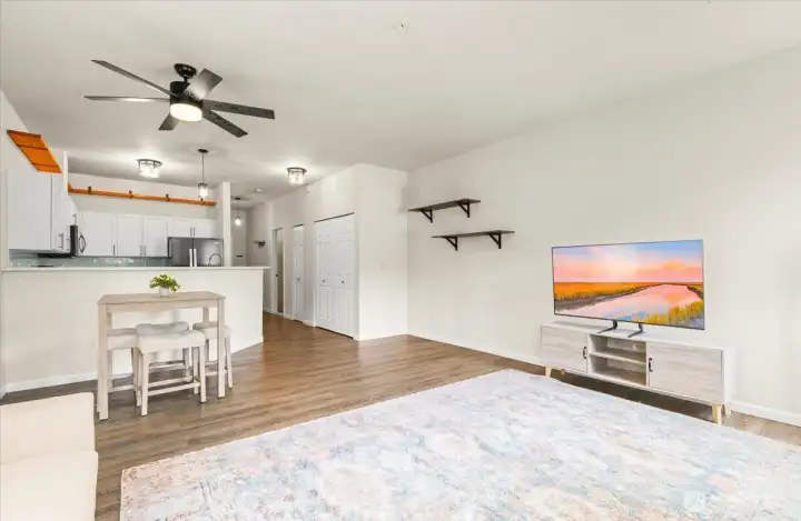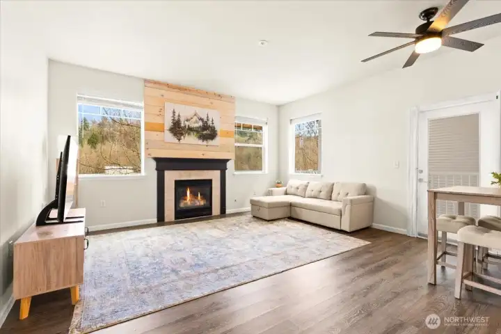 Prime location! Welcome to this beautifully updated condo in the desirable Riverfront Landing community. This light-filled home features 9-ft ceilings, an open floor plan, and a stunning remodeled kitchen with massive granite countertops, new cabinetry with soft-close drawers, stainless steel appliances, and abundant storage. The spacious living area offers a stylish accent wall and cozy gas fireplace, opening to an oversized wrap-around deck—perfect for morning coffee, relaxing evenings, or entertaining guests. The oversized primary suite provides plenty of space to relax or work from home, complete with a private bath featuring dual vanities and a generous walk-in closet. Enjoy an incredible outdoor lifestyle right outside your door. Located along the Sammamish River with direct access to the Burke-Gilman Trail, you can bike, walk, or explore miles of scenic trails. Stroll into downtown Bothell for coffee, dining, and local shops, or launch your kayak and paddle toward Woodinville’s wineries. Additional highlights include extra exterior storage, two designated covered parking spaces in a secure garage, kayak storage, guest parking, and convenient elevator access. Ideally located just minutes from major freeways, shopping, dining, recreation, and Lake Washington, this home offers the perfect balance of nature, convenience, and vibrant Eastside living. Experience the beauty of riverfront living—schedule your showing today.