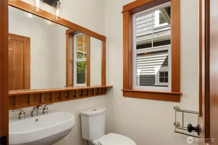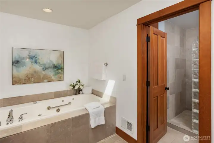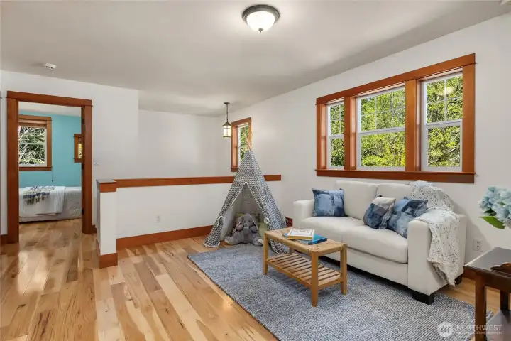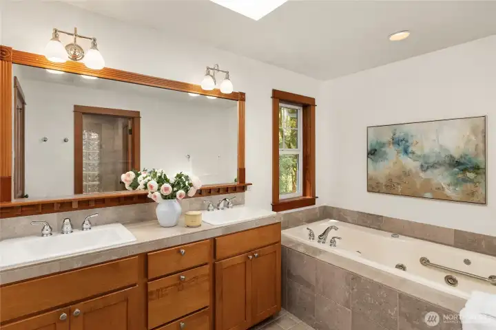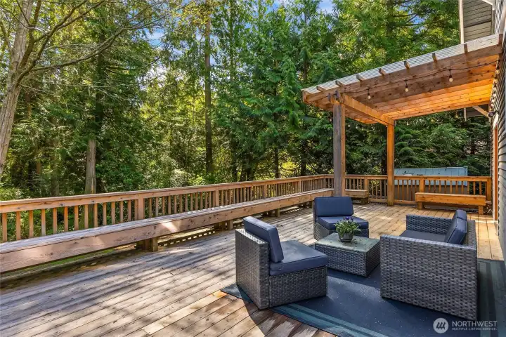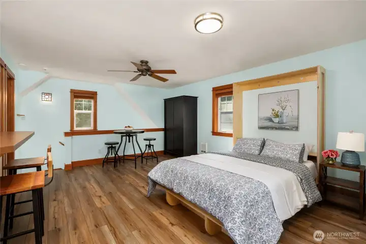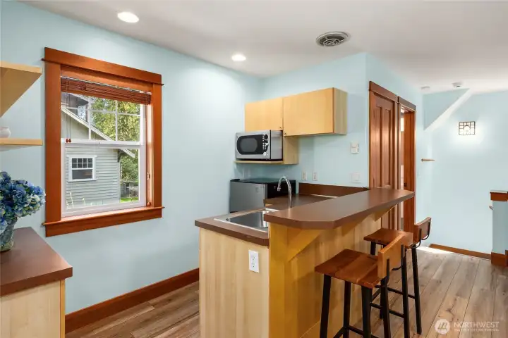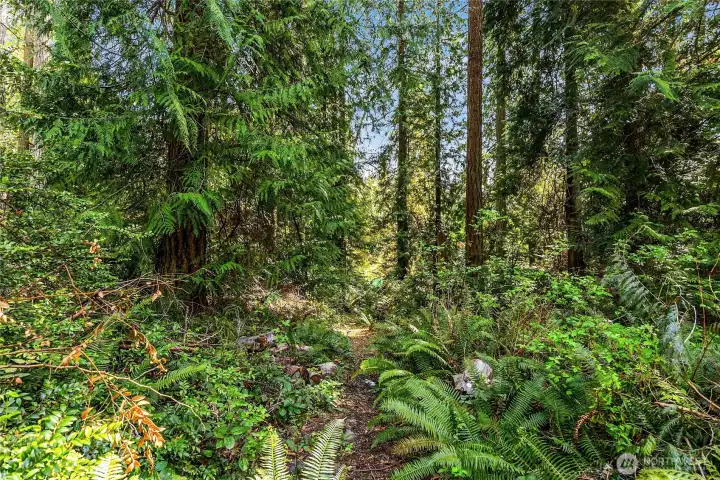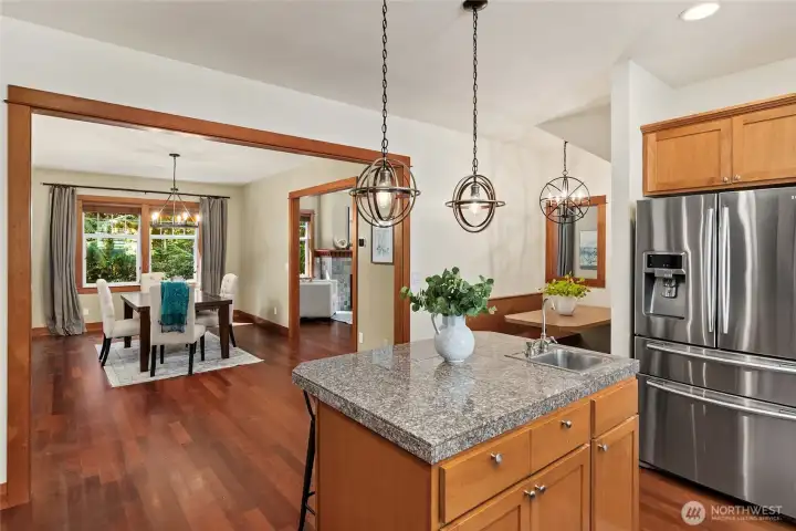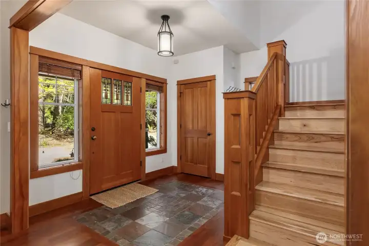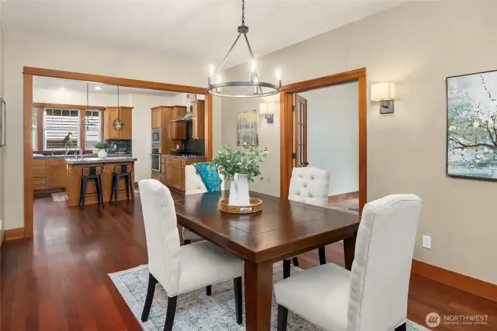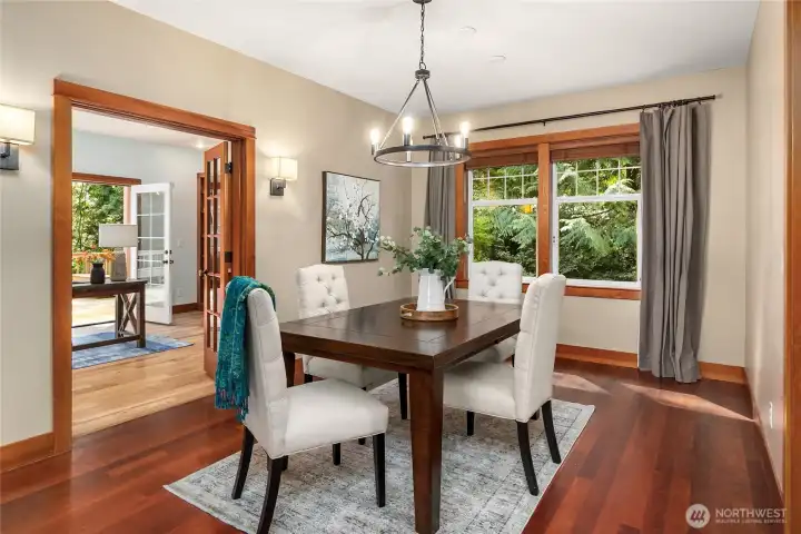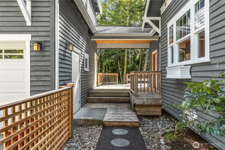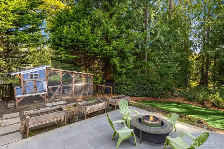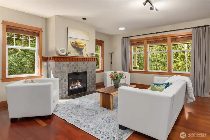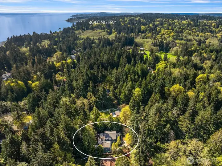 Set on just under an acre in a peaceful, quiet location, less than a mile from Fay Bainbridge Park and only minutes from Rolling Bay, this thoughtfully designed Craftsman offers timeless character, flexible living, and a beautiful Bainbridge Island setting. A classic covered front porch welcomes you into interiors defined by tall ceilings, a slate foyer, stained glass front door, solid-core wood doors, wood-framed windows, and rich Moabi hardwood floors through the main living areas. The inviting living room centers around a gas fireplace, while the spacious kitchen features cherry cabinetry, granite countertops, a center island with prep sink, propane cooktop, wall oven, and a charming breakfast nook. Formal and informal spaces connect easily for everyday living and entertaining, and the office/den offers built-in bookcases and French doors opening to the deck. Above the detached two-car garage, approximately 460 sqft of finished space with a kitchenette and 3/4 bath offers exceptional flexibility for guests, a studio, media room, or private workspace. Outside, the lifestyle continues with a large back deck, stone patio and fire pit, raised garden beds, a spacious private yard, trails through the forest, chicken coop, and a covered walkway connecting the garage and house.