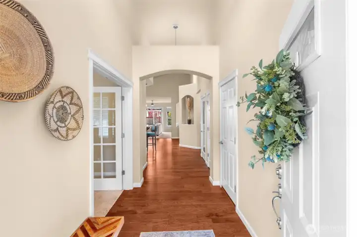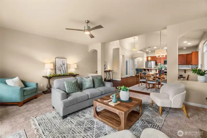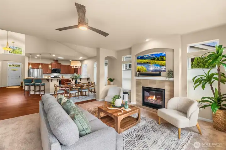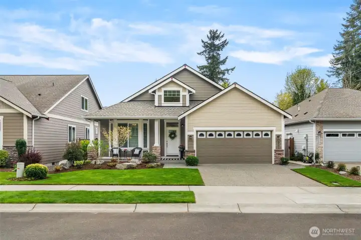 Fall in love with this picture-perfect rambler in the peaceful, sought-after Black Lake Palisades community in Tumwater! Exceptionally maintained & thoughtfully updated, this home offers a beautiful balance of refined finishes & effortless comfort. Pride of ownership shines throughout—from meticulous care & routine servicing to professionally curated landscaping that delivers color & charm in every season. Vaulted ceilings, expansive windows & sun tunnels fill the open-concept layout with natural light, creating an airy, welcoming atmosphere & highlighting elegant architectural details. Gourmet kitchen features newer stainless-steel appliances, slab granite counters, custom cabinetry & engineered hardwoods—opening seamlessly to the dining area & inviting great room with cozy gas fireplace. Just beyond, a slider leads to a serene backyard retreat with expansive, partially covered patio, brick walkway & a delightful collection of miniature trees, shrubs & perennials. The primary suite is a true retreat with a spa-inspired bath, dual vanities, soaking tub, walk-in shower & a generous walk-in closet. A second bedroom & full bath offer flexibility, while French doors open to a vaulted den or optional third bedroom with full closet & lovely front yard views. Spacious XL 2-car garage with built-ins, floor to ceiling storage cabinetry, tankless water heater, & heat pump A/C. Elevated in design, effortless in upkeep—this is easy, low-maintenance living at its finest!