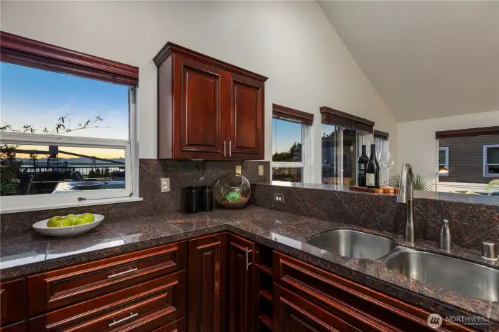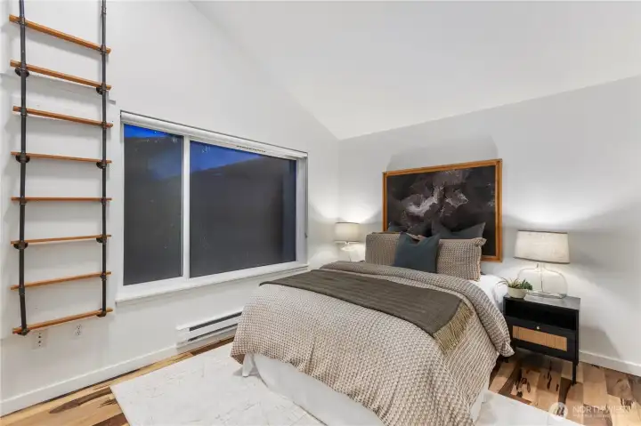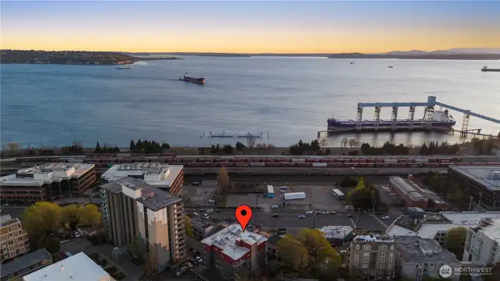 Welcome to penthouse living without the penthouse price tag! A rare top-floor unit offering elevated living on the western slope of Queen Anne. Soaring vaulted ceilings and expansive windows fill the home with natural light, while your private 800 sq ft deck becomes a true extension of the living space complete with your own new hot tub and sweeping views of Puget Sound and the Olympics. This spacious two-bedroom residence is uniquely designed with three versatile loft spaces, offering flexibility for work, guests, or additional storage. With only one shared wall, the home lives with exceptional privacy. Enjoy the convenience of two deeded parking spaces and a large private storage unit in a secure garage — a rare find in this prime location. Just moments from Climate Pledge Arena and the shops, dining, and charm of Queen Anne Ave, this condo offers the perfect balance of tranquility and city living. With an impressive 87 Walk Score, everything you need is close by. Every box is checked and then some!