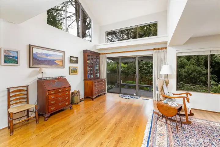 This inviting living room is filled with natural light, highlighted by soaring ceilings and expansive windows that bring the outdoors in. Warm hardwood floors, a cozy seating area, and beautiful built-in details create a comfortable yet refined space that flows seamlessly into the dining area, perfect for both everyday living and entertaining.