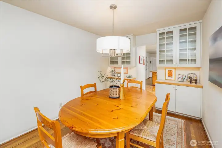 The bright and functional breakfast nook offers a cozy spot for everyday dining, with large windows bringing in natural light and easy access to the side yard. A wall of discreet closet doors provides abundant storage, thoughtfully concealing a pantry and full-size washer and dryer for added convenience.
