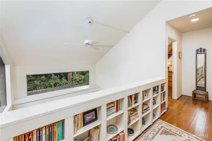 The second floor hallway features custom built-in bookshelves and overlooks the dramatic living area below, enhancing the home’s open, architectural design. Walls of windows bring in natural light and leafy views, creating a bright and visually striking transition between the bedrooms.