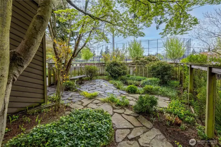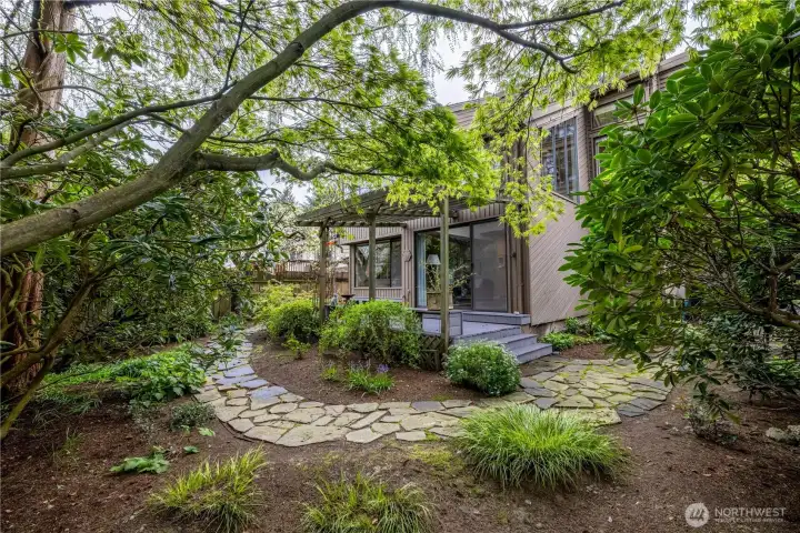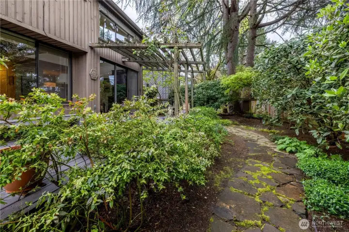 The side yard offers a peaceful extension of the garden, with winding stone pathways and lush plantings that create a sense of privacy and tranquility. Ideal for gardening enthusiasts, this serene space provides ample opportunity to cultivate and enjoy a variety of plantings in a quiet, natural setting.
