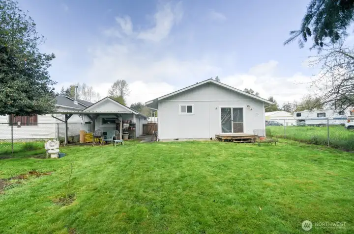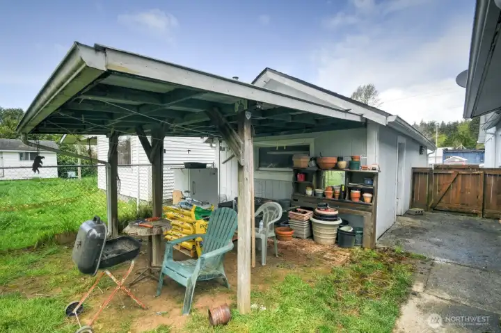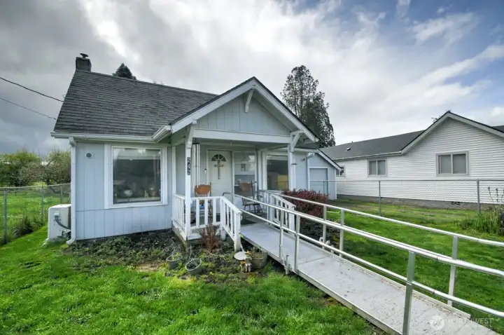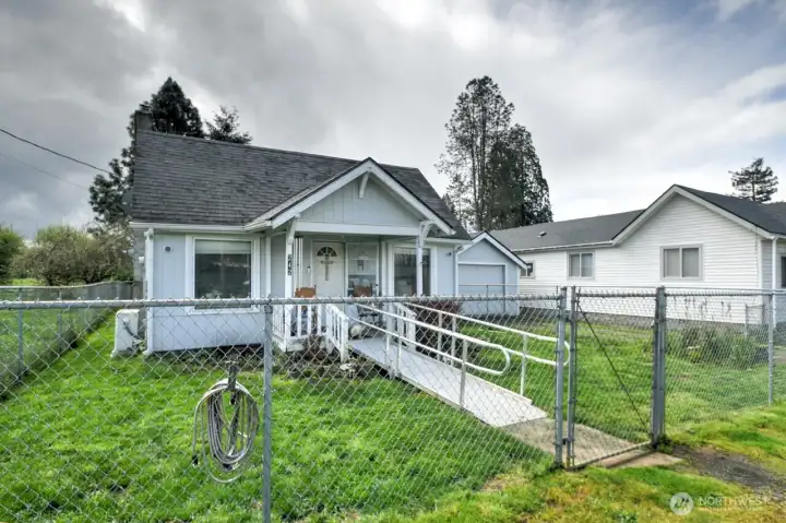 Charming 3-bedroom, 1-bath home featuring a large, comfortable living room and a functional layout. The bathroom includes a convenient walk-in tub for added accessibility and comfort. The property offers a fully fenced yard, providing privacy and space for outdoor activities, with a paved alley providing easy access to the back of the property. A detached one-car garage includes additional workspace, perfect for hobbies, storage, or projects. The home also features a handicap-accessible ramp to the front door. Ideally located within walking distance to grocery stores, schools, the post office, and local restaurants, making everyday errands and dining out easy and convenient.