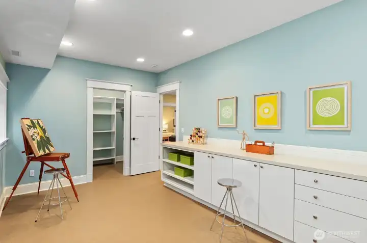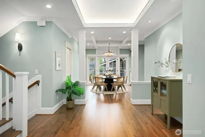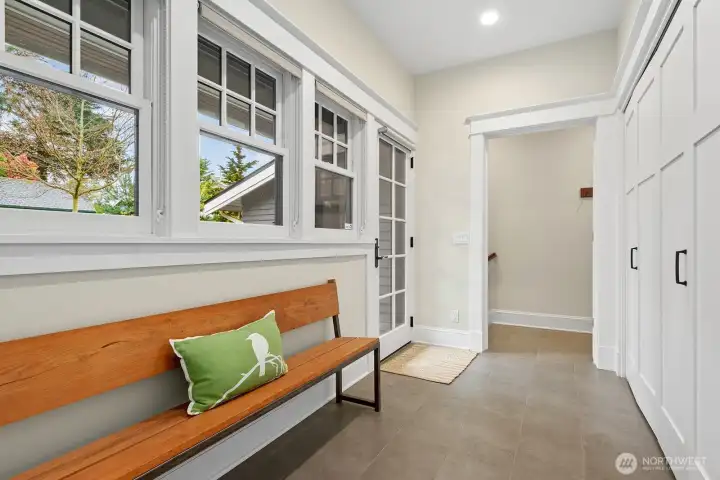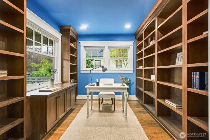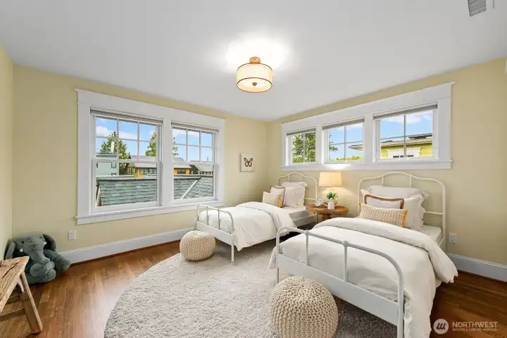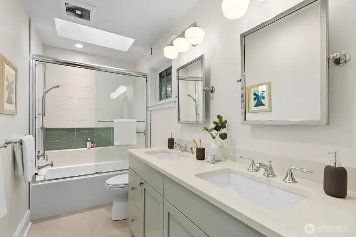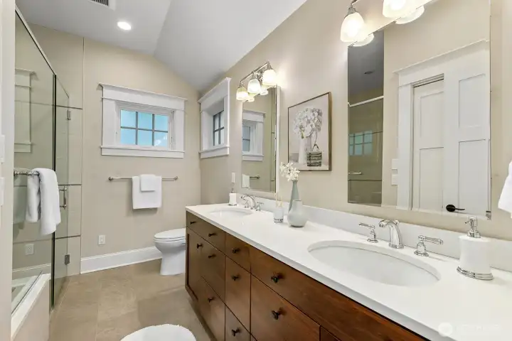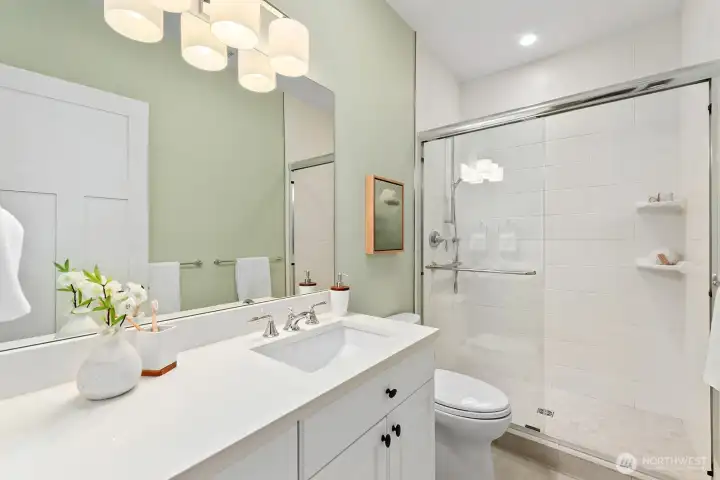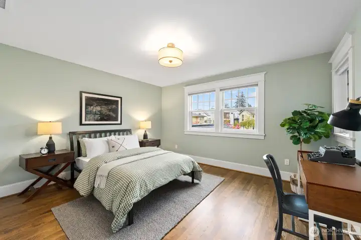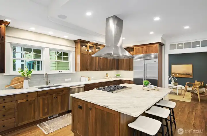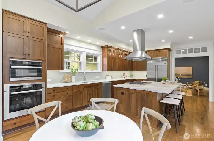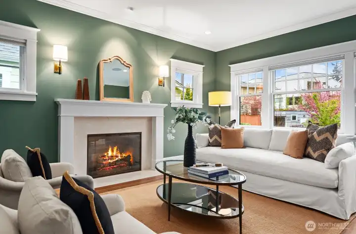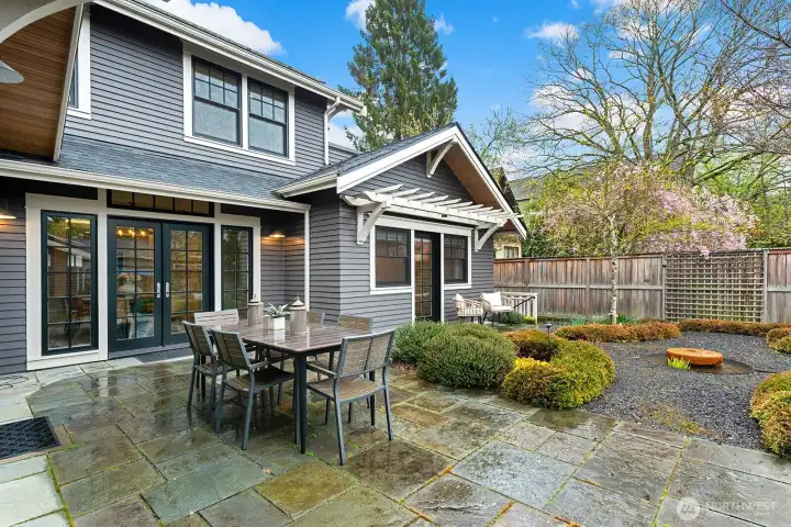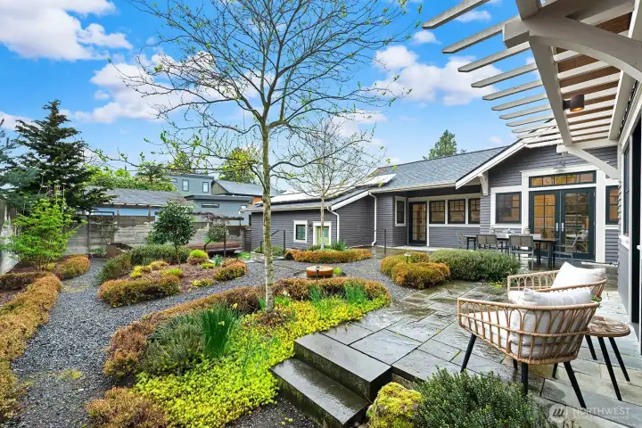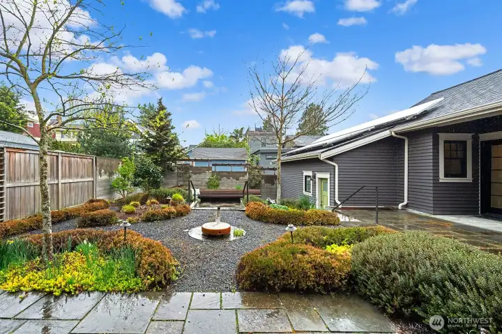 This Green Lake Craftsman is a Masterclass in exquisite design, function, beauty and location! Custom designed home built to the finest specification and detail on a lovely, quiet street. In floor heat and central A/C are throughout the home. Solar panels provide household electricity. Attached 2 car garage has easy alley access and is wired for EV charger. The Main floor features a spacious entry hall, living room w/ gas fireplace, office, dining room, powder room and chef's kitchen w/ island, breakfast room, Wolf, Subzero and Miele appliances. A main floor Primary suite offers a spacious bath, heated floors, generous built-ins and overlooks the stunning garden, water feature and bluestone patio. The 2nd level offers 3 bedrooms and a full bath. The lower level features an entertainment size family room with wet bar, wall mounted tv, pool table, workout room, art studio, guest room and a 3/4 bath. Abundant storage is found on every level. Professionally designed and landscaped outdoor spaces are an entertainer's dream! Landscaping includes irrigation and lighting systems, elegant water feature, Bluestone patio, natural gas hookup and grill. Walk to Green Lake and charming Tangletown cafes from this amazing home!