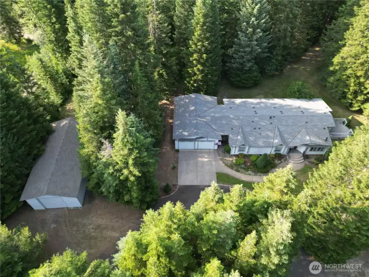 Peaceful country living with space, privacy, and convenience. This 2,440 sq ft home sits on 4.6 wooded acres and offers 3 bedrooms, 2 bathrooms, and two living areas, including one with a fireplace. The bright eat-in kitchen features an island, walk-in pantry, and deck access. The primary suite includes dual walk-in closets, double sinks, and a private office with built-in cabinetry. Additional bedrooms also feature walk-in closets, and the large laundry room adds everyday convenience. New forced air furnace and central air conditioner installed in 2025. Outside, you'll find an oversized 25' x 35' garage, a 24' x 50' shop with 12' doors, storage shed, and RV pad with 30/50 amp power and water. Fruit trees and mature timber enhance the setting. Conveniently located approximately 4 minutes from Deer Park and a short drive to shopping, dining, and other services.