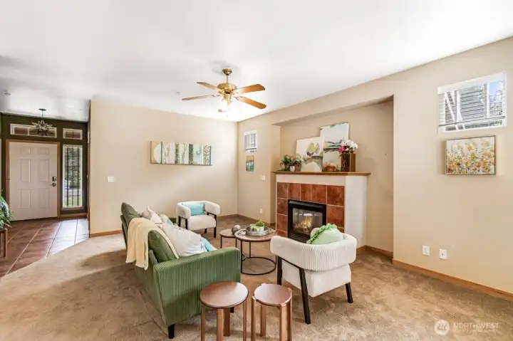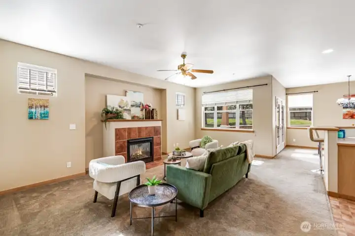 Beautiful single level Craftsman home located within 55+ senior community has no stairs. Condo fees cover all exterior maintenance (roof, windows, exterior paint, landscaping and snow removal, including personal driveway and sidewalk). Built on a premium lot with long driveway for extra parking. Back patio opens to pine-treed community common space. Welcoming front porch and foyer provides access to den/office. Great room with volume ceiling and gas fireplace. Functional kitchen with eating bar, walk-in pantry and abundant cabinets. Smooth-top range, built-in microwave, dishwasher, trash compactor and refrigerator included. From dining area gain access to private patio. Primary suite with plenty of natural light and transom windows, large shower, double sinks and walk-in closet. Second bedroom has window seat and access to second full bath and linen. Laundry room with sink accesses oversized garage with storage/shop area. Enjoy the lifestyle!