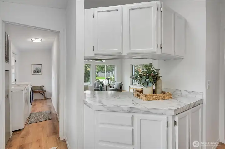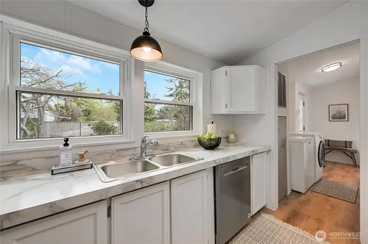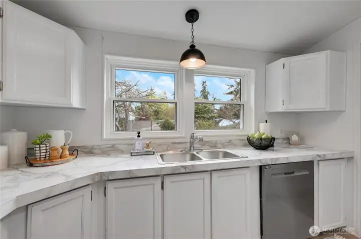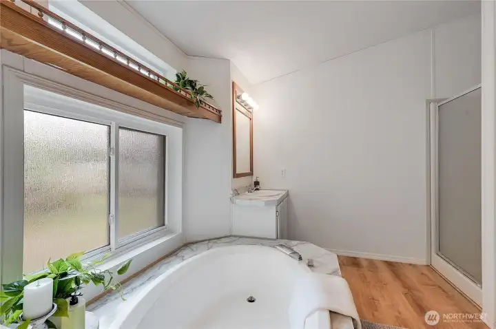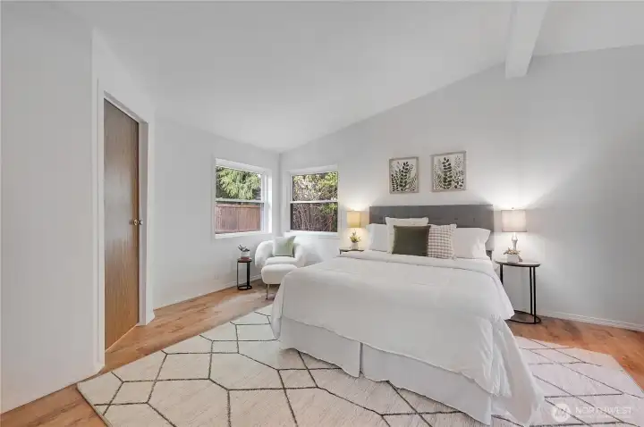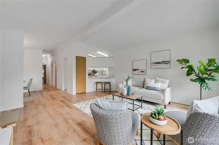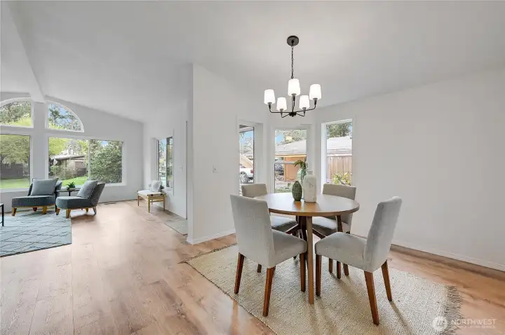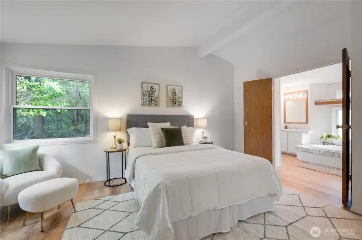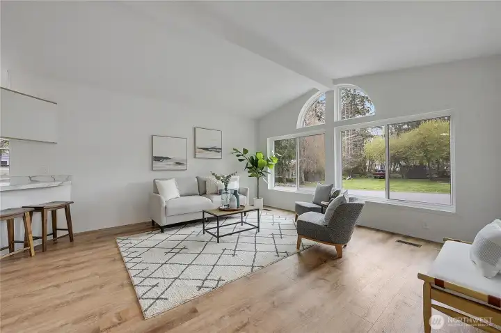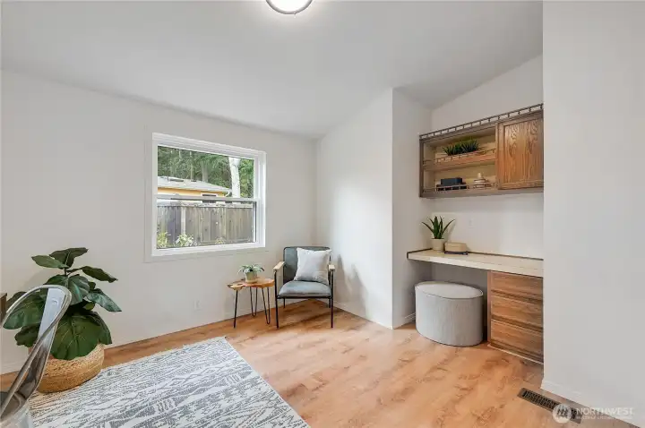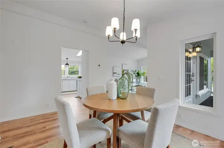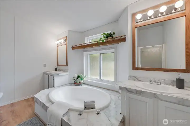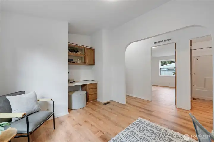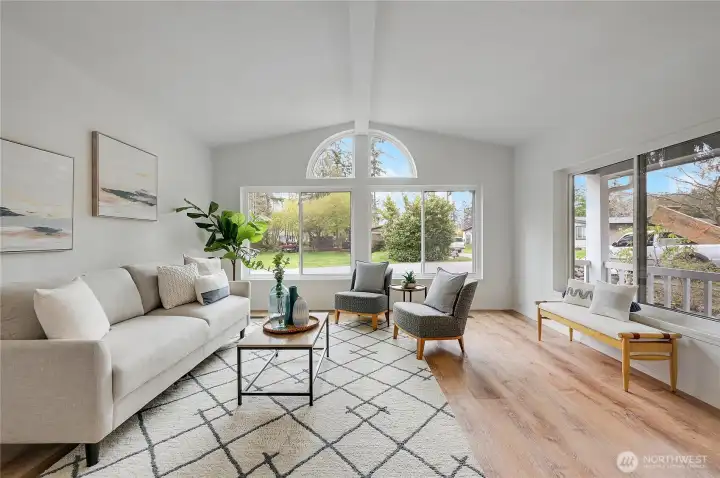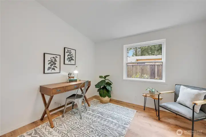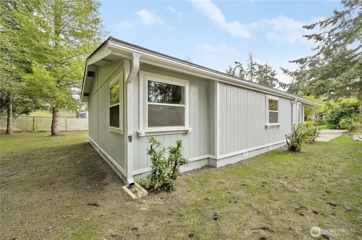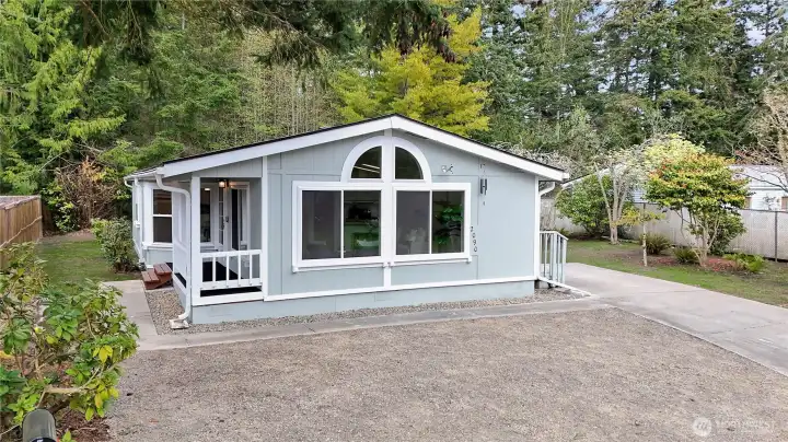 Light, bright, and move-in ready in Port Townsend. This 2-bedroom, 2-bath plus office manufactured home offers comfortable one-level living with vaulted ceilings and large windows that bring in great natural light. The spacious living room features an eye-catching arched window and flows easily into the dining area, creating a comfortable and functional layout. The kitchen offers plenty of cabinet and counter space, while the nearby dining area is perfect for everyday meals or casual entertaining. The primary bedroom includes a walk-in closet and private bath with dual sinks, soaking tub, and separate shower. A second bedroom and dedicated office provide flexible space for guests, hobbies, or working from home. New flooring and a fresh coat of paint throughout. Enjoy the welcoming covered front porch, easy-care yard, and convenient location close to parks, shopping, and all the charm of Port Townsend. An additional small lot approximately 18' x 90' offers extra space for gardening, storage, or future possibilities. Comfortable, low-maintenance living in a bright and inviting home.