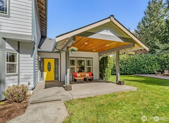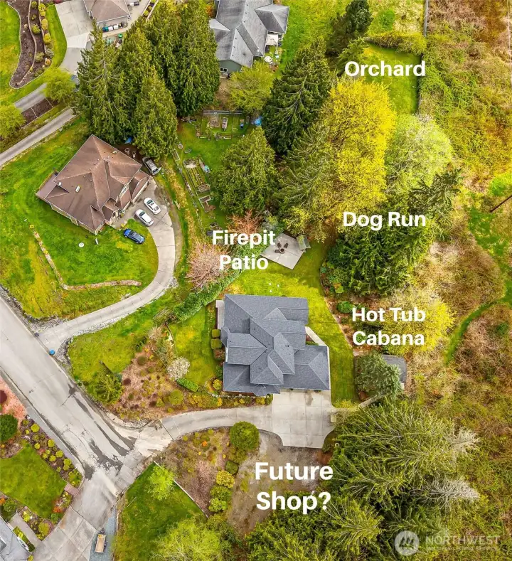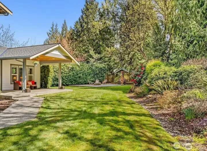Fire pit patio with covered wood storage. The gate to the orchard is just beyond.
