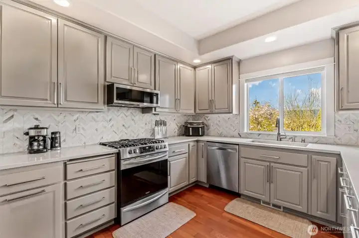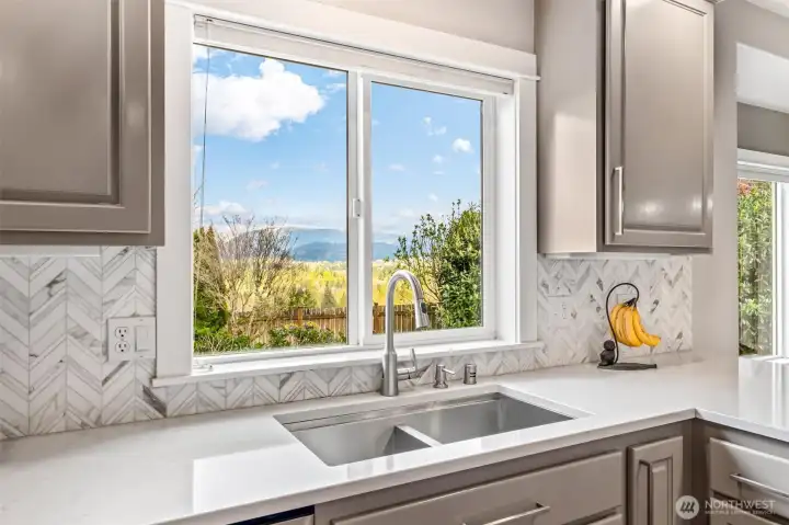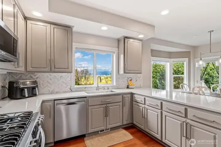 Sweeping, unobstructed mountain views define this beautifully updated home, perfectly positioned on a quiet dead-end street for ultimate privacy. Thoughtfully designed to capture natural beauty from every angle, this residence blends timeless architecture with modern upgrades. MAIN LEVEL PRIMARY SUITE features a spa-inspired 5 piece tiled bath with walk-in shower, soaking tub and large walk in closet. Fully REMODELED CHEF'S KITCHEN (2022) showcases stainless appliances, quartz countertops, full height tile backsplash and professionally painted cabinets. Formal living and dining rooms with 9’ ceilings and rich Craftsman millwork create an elegant setting, while the inviting family room offers a tiled propane fireplace with custom mantle. Upstairs offers three oversized bedrooms and two UPDATED BATHS (2024–2025), ideal for a second primary suite or flexible living. Recent improvements include NEW ROOF (2026, transferable warranty), NEW CARPET (2026), updated lighting, and designer interior paint palette throughout. Outdoor living shines with a composite dining deck, a covered entertaining patio, a spacious fire pit area, covered wood storage, a dog run, and a fully fenced orchard with fruit trees and garden space. Additional highlights include a covered hot tub, RV parking, 240V garage outlet, private HOA trail access, extra parking and room to build your dream shop (buyer to verify). Enjoy a peaceful setting backed by protected acreage for long-term privacy.