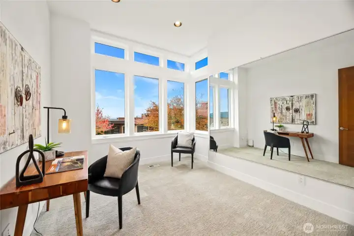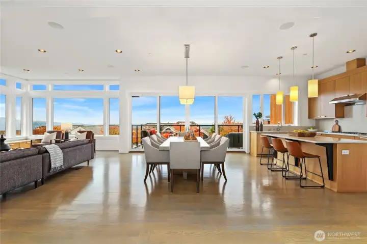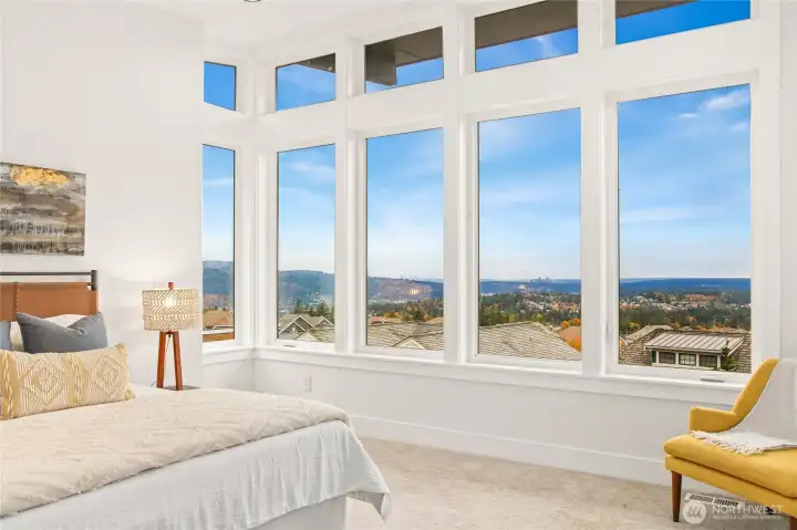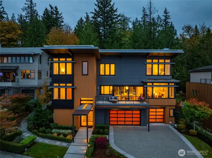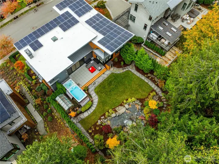 Modern solar-powered resort living with panoramic views of Seattle, Bellevue, and Issaquah foothills, perched high in the Harrison St neighborhood! Climb the dramatic entry stairway to a life above the clouds, basking in sunshine even on misty mornings. Thoughtfully designed for light, art, and connection, featuring gallery-like spaces w/ stunning views. A luxurious Primary Suite w/ spa-inspired finishes. Indoor/outdoor living in a resort-style backyard with a spectacular water fall, modern fire pit, greenhouse, swim spa and a hot tub. Ideal for entertaining or unwinding. Nestled on a private and lush greenbelt lot this property has it all with a sleek and custom 3-car garage, EV charging plug, solar array, and other property enhancements as part of $700K in premium upgrades since last sale. Award winning Issaquah Schools. close to transit and sited near shopping and restaurants. Truly modern, mindful, magnificent!