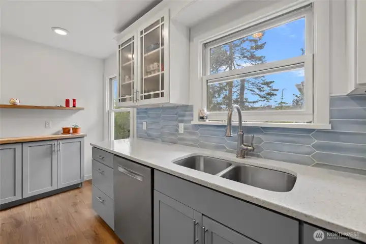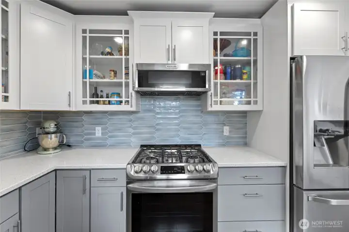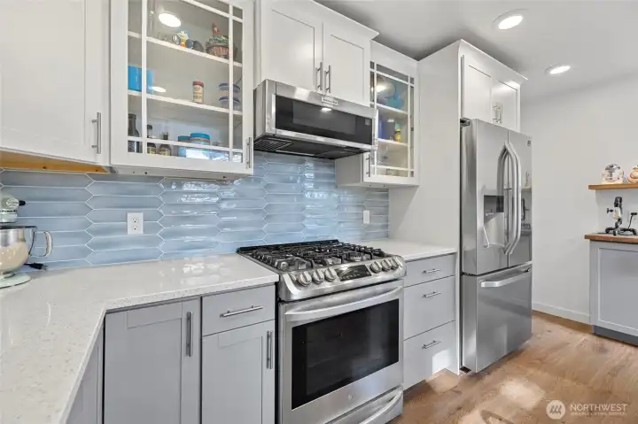 Gorgeous updated kitchen. 5 burner gas cook top, tile backsplash and shaker cabinets.