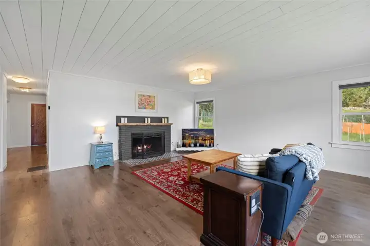 Spacious, light filled living room with painted wood plank ceilings and a real wood fireplace.