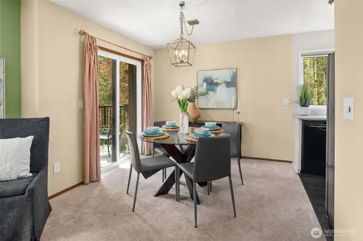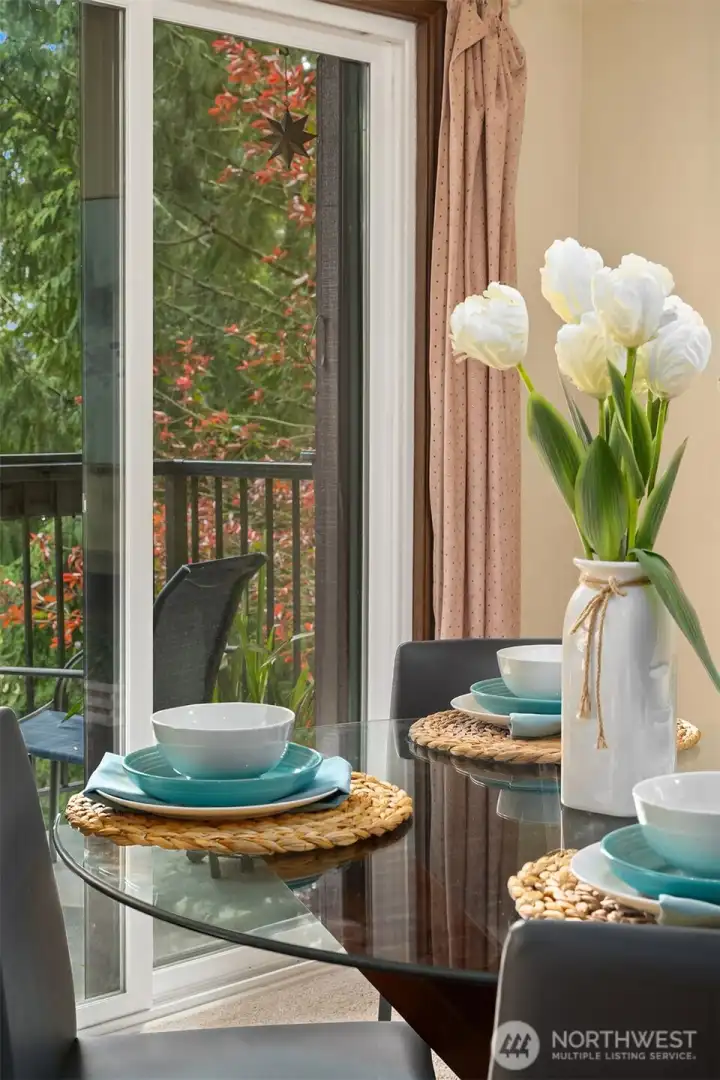 Dining area with access to view balcony.