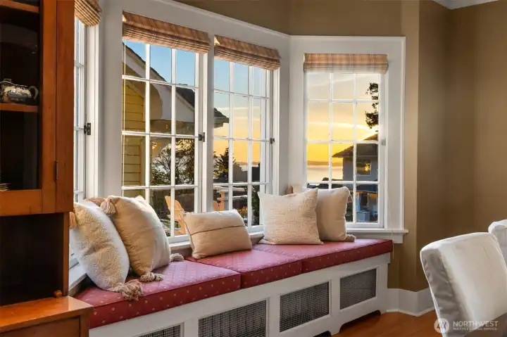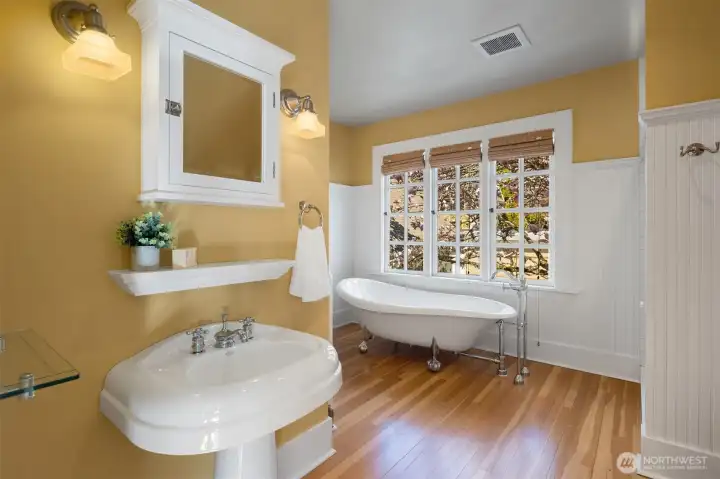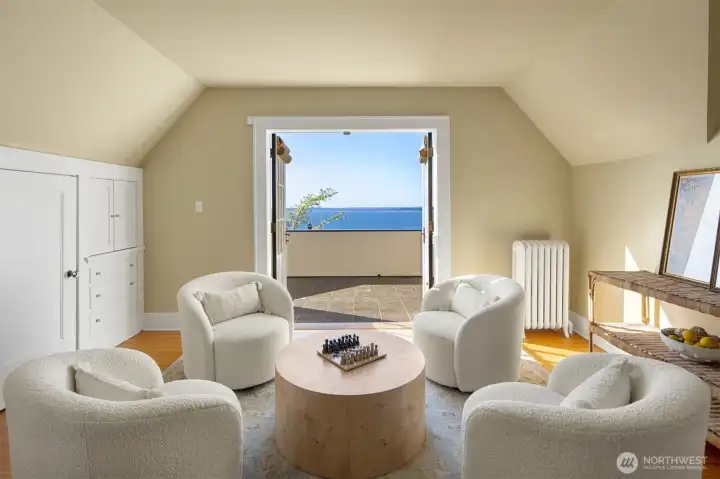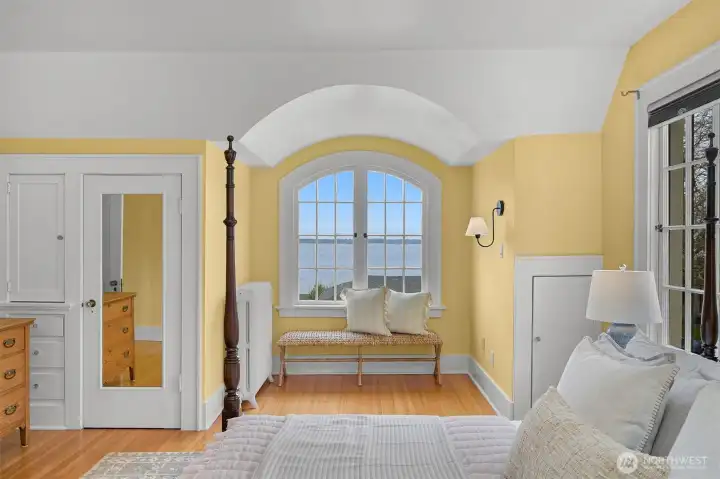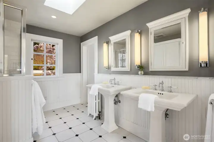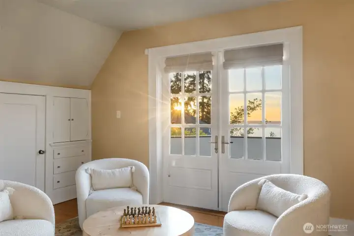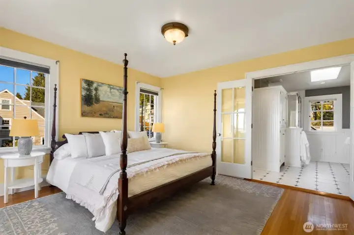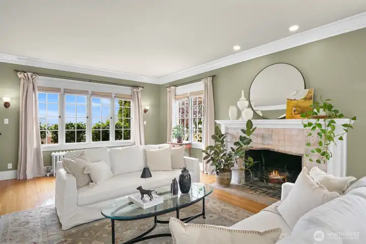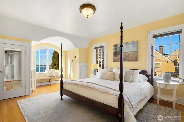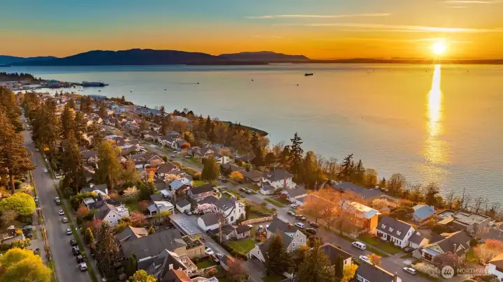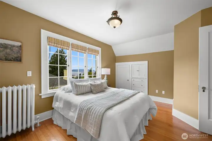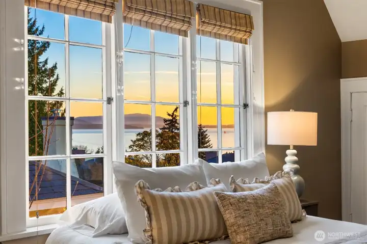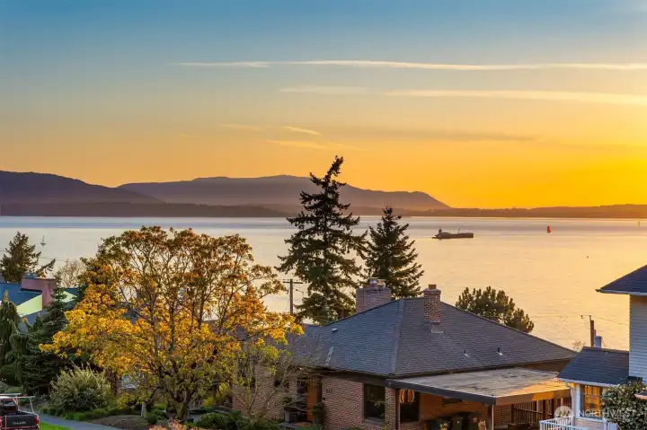 Classically elegant South Hill home with preserved historic character and a refined European influence. Original details and warm, endearing spaces make it easy to fall in love the moment you walk in. Many rooms capture beautiful bay views, while a spacious balcony offers sweeping 180-degree views out to the islands—inviting you to slow down and take it all in. Thoughtfully updated kitchen and baths reflect a classic, timeless style. The welcoming floor plan is made for both cozy holiday gatherings and summer garden parties, with French doors from the kitchen and living room opening seamlessly to the patio and yard. Upstairs, two beautifully appointed en-suite bedrooms—including a gracious primary suite with a rare, oversized walk-in closet—offer comfort and privacy. A guest suite on the lower level is complemented by a built-in office and media room. You’ll also find an impressive laundry room with generous storage and a charming farmhouse sink. Two-car detached garage off the alley, plus ample parking in the driveway out front. Sprinkler system in the expertly designed yard which includes mature landscaping, fruit trees and impressive hardscaping. Wonderfully maintained home includes cozy radiant heat, restored siding, and a brand new roof. Set on one of South Hill’s most sought-after streets, with flat sidewalks and just moments to Boulevard Park, Fairhaven, and downtown. Worth noting that the view is legally protected on this home. This one is truly a rare gem!