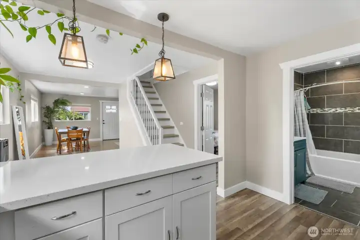 This stunning Craftsman home is tucked away in the heart of McKinley, blending timeless charm with modern amenities. As you step inside, an open floor plan seamlessly connects the living area to a spacious, renovated kitchen outfitted with quartz countertops, soft-close shaker cabinets, and sleek stainless steel appliances. The bathroom offers a spa-like retreat with tiled floors, perfect for unwinding and rejuvenating. You’ll find one bedroom on the main floor, plus two more upstairs. Outdoors, the fully fenced yard is ideal for hosting unforgettable gatherings or letting your furry pup run free! Easy back alley access to the detached garage provides an opportunity for future DADU development. Unfinished basement full of potential additional space. Enjoy local favorites like nachos at Top of Tacoma, burgers at Dusty’s Hide Away, or coffee at Lux, all just moments away. Convenient freeway access and proximity to downtown Tacoma, museums, Tacoma Dome, restaurants, marinas and shops add to the appeal.