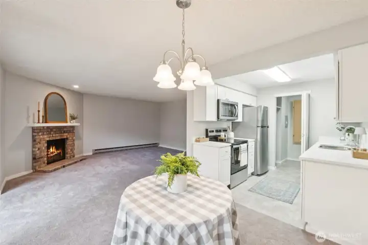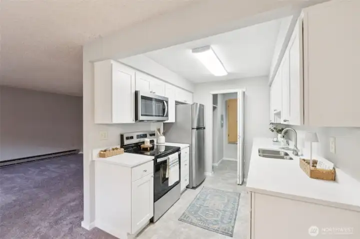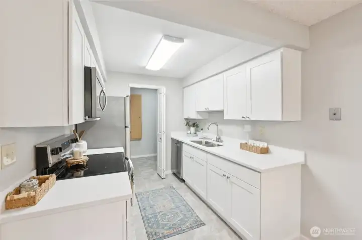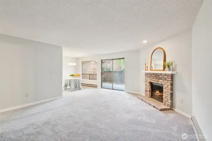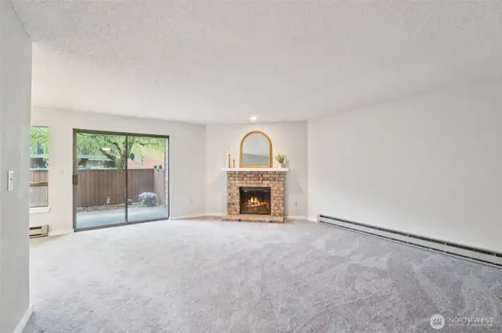 Welcome to Sunset Plaza Condos, where comfort and convenience meet in this inviting garden-level 2 bed, 2 bath home. Top to bottom remodel including all new flooring, doors and trim and all hardware, light fixtures, kitchen cabinets and counters, appliances and bathroom vanities and sinks. The expansive living room flows seamlessly into an updated galley-style kitchen featuring quartz countertops, stainless steel appliances, and abundant storage, plus a combined laundry and pantry area. Enjoy easy single-level living with a primary suite offering an attached ¾ bath, along with a spacious second bedroom and full bath. A cozy wood-burning fireplace adds warmth, while the large, fenced private patio—partially covered—creates the perfect space for year-round relaxation. Community amenities include scenic trails, an outdoor pool, clubhouse with billiards and fitness area, garden space, and covered deeded parking. Custom blinds have been ordered and will be installed.