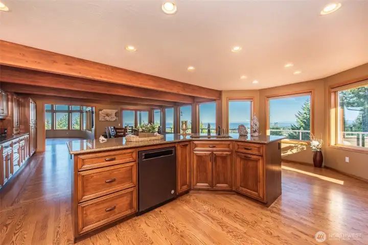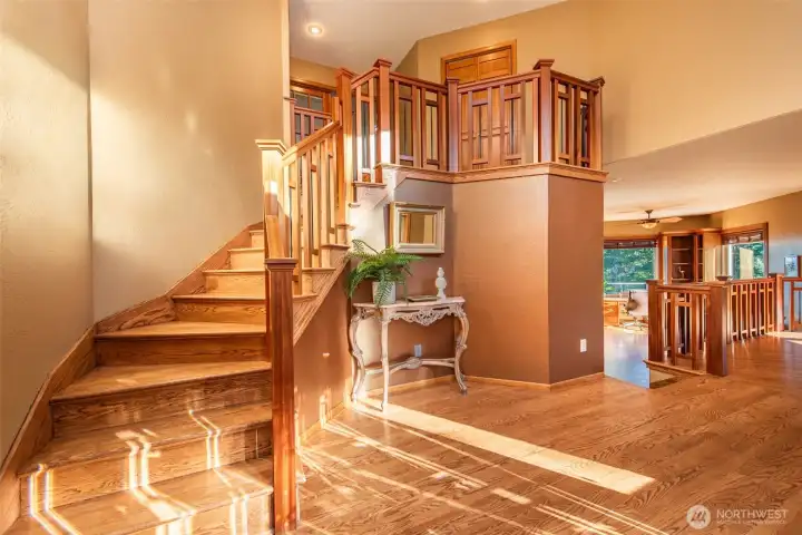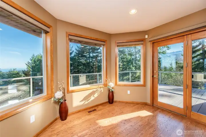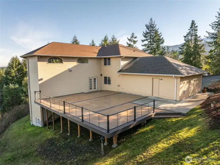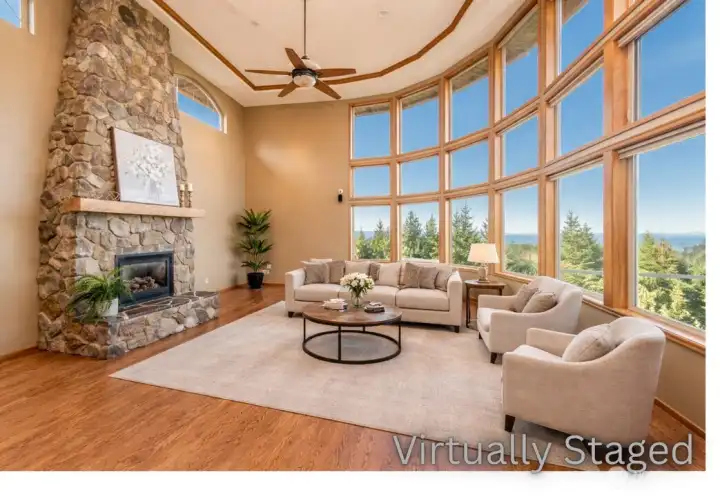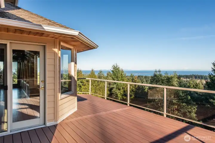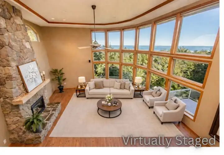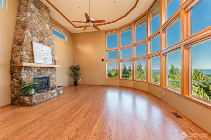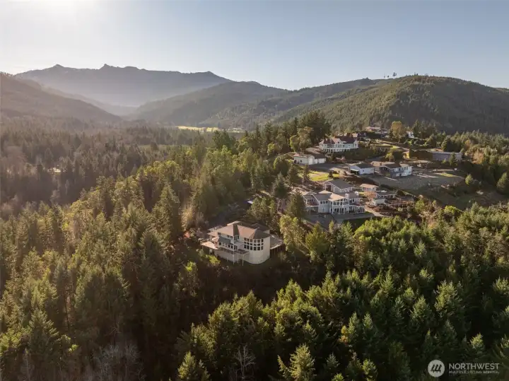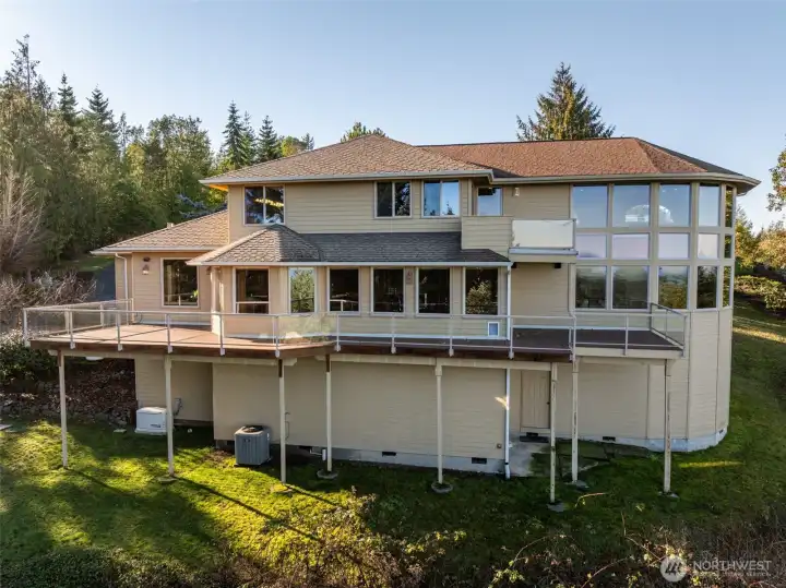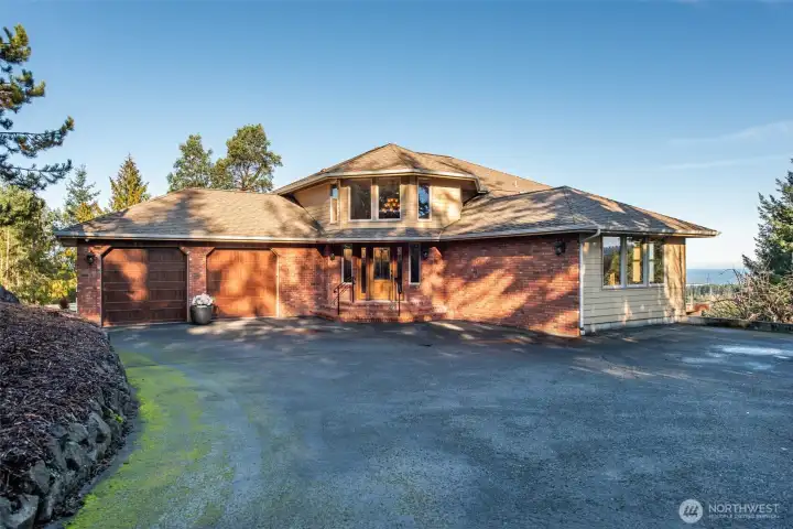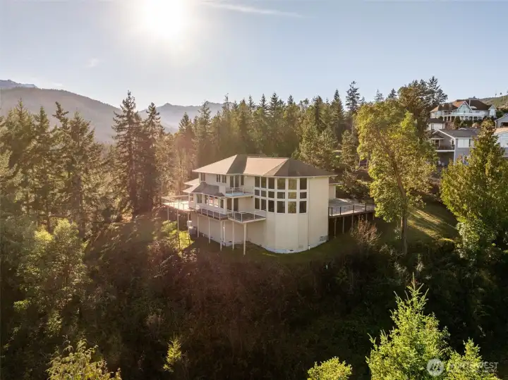 A property of singular distinction — architecturally compelling, impeccably finished, and positioned to deliver a lifestyle that few homes anywhere can offer. Perched atop Sunset Heights Drive on 5.05 private acres, this extraordinary 3-bedroom, 2.5-bath, 3,720 sq ft two-story residence commands one of the most coveted vantage points on the North Olympic Peninsula. Panoramic views of the Strait of Juan de Fuca, Mt. Baker, Port Angeles Harbor, Black Diamond, and Klahanne Ridge unfold before you in an unbroken sweep that changes with every season and every light. Inside, soaring 25-foot ceilings rise above a commanding stone fireplace in a great room that is at once grand and deeply livable. Rich hardwood floors, a gourmet kitchen with walk-in pantry, formal dining room, home office, and family room complete a main floor designed with as much thoughtfulness as elegance. The primary suite is a sanctuary, French door entry, private balcony with water and mountain views, jetted soaking tub, heated marble floors, and a generous walk-in closet. Two additional bedrooms, 2.5 beautifully appointed baths, and over 2,460 sq ft of composite deck round out a home built for exceptional living. A whole-home generator, security system, built-in vacuum, finished heated garage, and 1,000 sq ft of unfinished lower-level space add versatility and lasting value. Minutes from downtown Port Angeles and Olympic National Park.